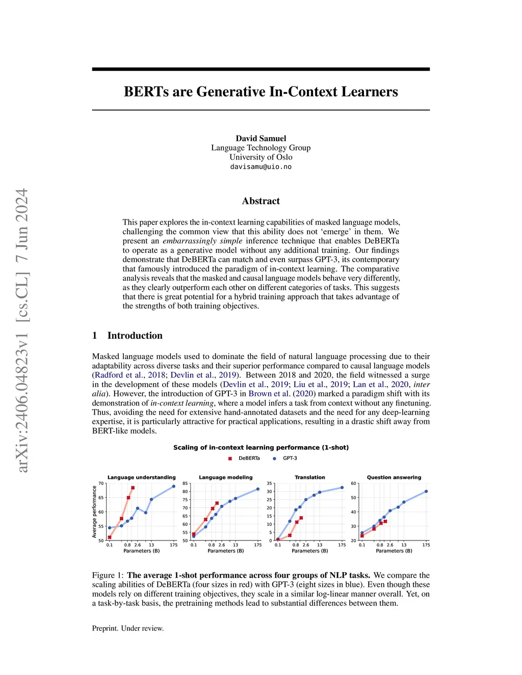 This paper explores the in-context learning capabilities of masked language models, challenging the common view that this ability does not émerge' in them. We present an embarrassingly simple inference technique that enables DeBERTa to operate as a generative model without any additional training. Our findings demonstrate that DeBERTa can match and even surpass GPT-3, its contemporary that famously introduced the paradigm of in-context learning. The comparative analysis reveals that the masked and causal language models behave very differently, as they clearly outperform each other on different categories of tasks. This suggests that there is great potential for a hybrid training approach that takes advantage of the strengths of both training objectives.