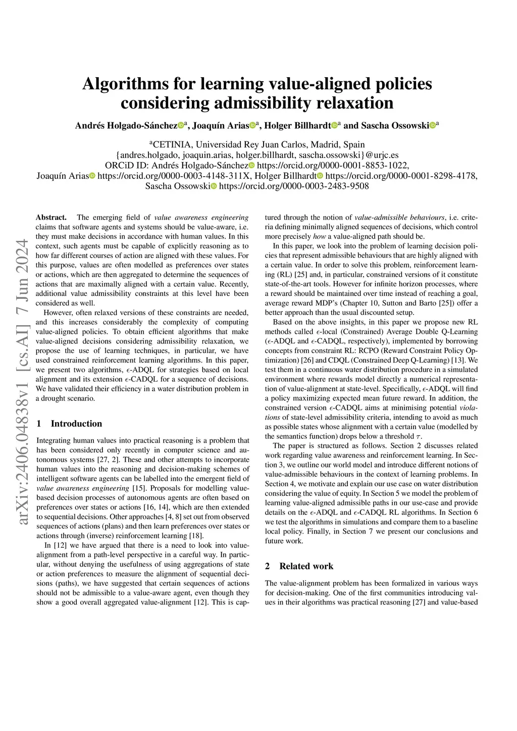 The emerging field of \emph{value awareness engineering} claims that software agents and systems should be value-aware, i.e. they must make decisions in accordance with human values. In this context, such agents must be capable of explicitly reasoning as to how far different courses of action are aligned with these values. For this purpose, values are often modelled as preferences over states or actions, which are then aggregated to determine the sequences of actions that are maximally aligned with a certain value. Recently, additional value admissibility constraints at this level have been considered as well. However, often relaxed versions of these constraints are needed, and this increases considerably the complexity of computing value-aligned policies. To obtain efficient algorithms that make value-aligned decisions considering admissibility relaxation, we propose the use of learning techniques, in particular, we have used constrained reinforcement learning algorithms. In this paper, we present two algorithms, for strategies based on local alignment and its extension for a sequence of decisions. We have validated their efficiency in a water distribution problem in a drought scenario.