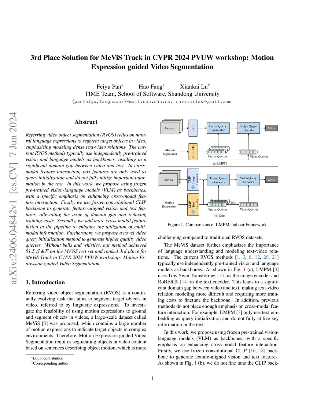 Referring video object segmentation (RVOS) relies on natural language expressions to segment target objects in video, emphasizing modeling dense text-video relations. The current RVOS methods typically use independently pre-trained vision and language models as backbones, resulting in a significant domain gap between video and text. In cross-modal feature interaction, text features are only used as query initialization and do not fully utilize important information in the text. In this work, we propose using frozen pre-trained vision-language models (VLM) as backbones, with a specific emphasis on enhancing cross-modal feature interaction. Firstly, we use frozen convolutional CLIP backbone to generate feature-aligned vision and text features, alleviating the issue of domain gap and reducing training costs. Secondly, we add more cross-modal feature fusion in the pipeline to enhance the utilization of multi-modal information. Furthermore, we propose a novel video query initialization method to generate higher quality video queries. Without bells and whistles, our method achieved 51.5 J&F on the MeViS test set and ranked 3rd place for MeViS Track in CVPR 2024 PVUW workshop: Motion Expression guided Video Segmentation.