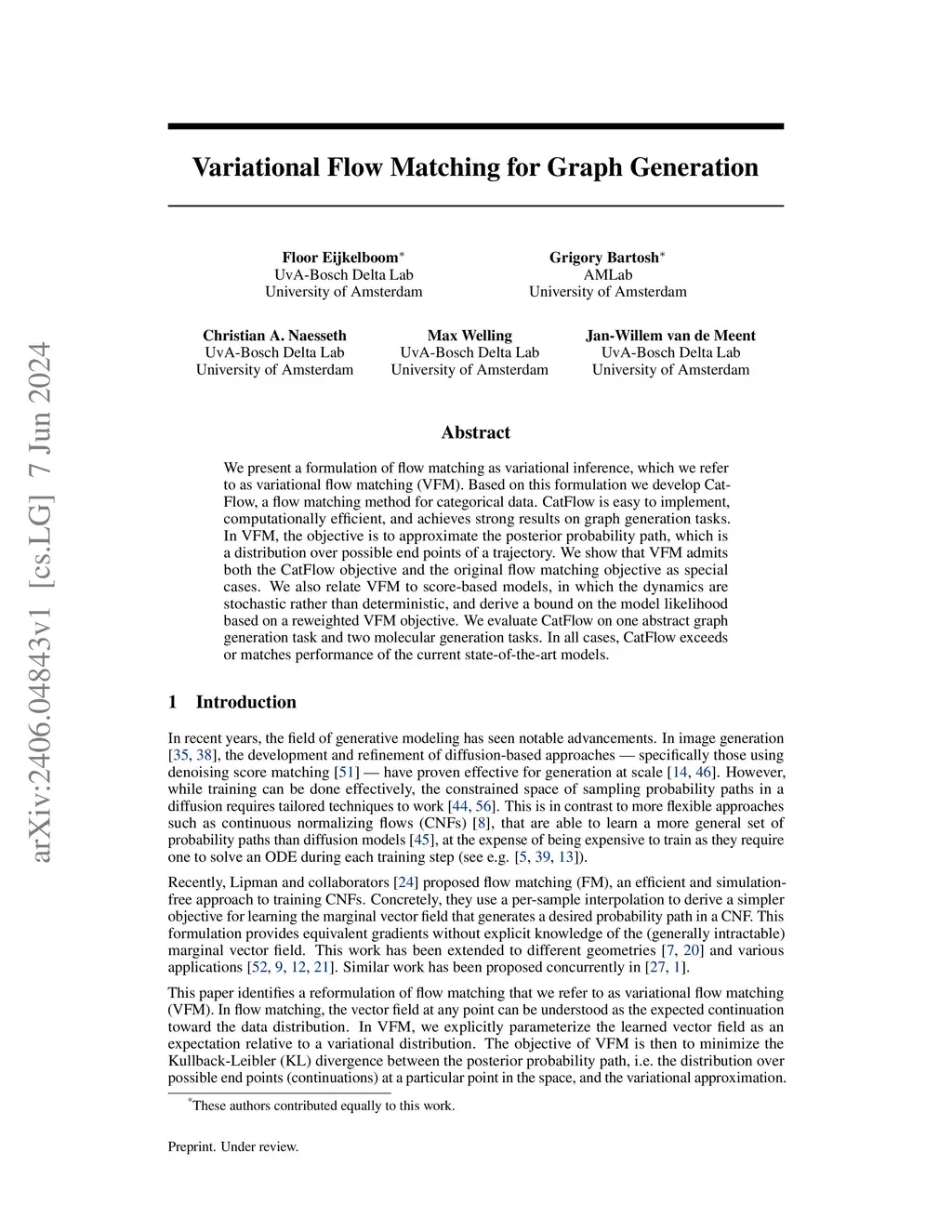 We present a formulation of flow matching as variational inference, which we refer to as variational flow matching (VFM). Based on this formulation we develop CatFlow, a flow matching method for categorical data. CatFlow is easy to implement, computationally efficient, and achieves strong results on graph generation tasks. In VFM, the objective is to approximate the posterior probability path, which is a distribution over possible end points of a trajectory. We show that VFM admits both the CatFlow objective and the original flow matching objective as special cases. We also relate VFM to score-based models, in which the dynamics are stochastic rather than deterministic, and derive a bound on the model likelihood based on a reweighted VFM objective. We evaluate CatFlow on one abstract graph generation task and two molecular generation tasks. In all cases, CatFlow exceeds or matches performance of the current state-of-the-art models.