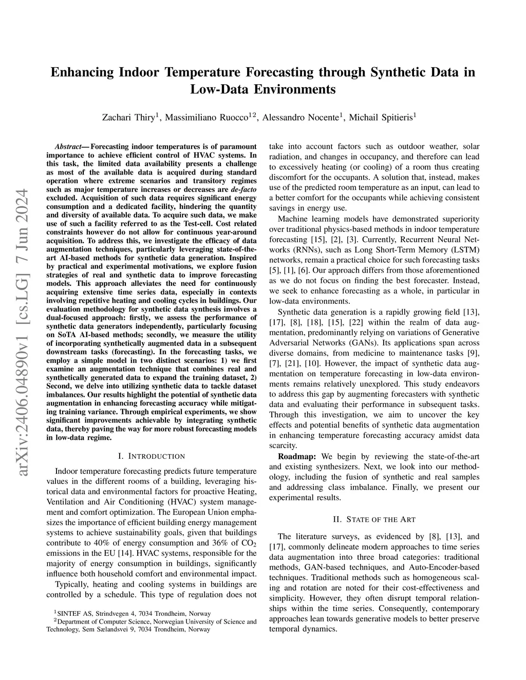 Forecasting indoor temperatures is important to achieve efficient control of HVAC systems. In this task, the limited data availability presents a challenge as most of the available data is acquired during standard operation where extreme scenarios and transitory regimes such as major temperature increases or decreases are de-facto excluded. Acquisition of such data requires significant energy consumption and a dedicated facility, hindering the quantity and diversity of available data. Cost related constraints however do not allow for continuous year-around acquisition. To address this, we investigate the efficacy of data augmentation techniques leveraging SoTA AI-based methods for synthetic data generation. Inspired by practical and experimental motivations, we explore fusion strategies of real and synthetic data to improve forecasting models. This approach alleviates the need for continuously acquiring extensive time series data, especially in contexts involving repetitive heating and cooling cycles in buildings. In our evaluation 1) we assess the performance of synthetic data generators independently, particularly focusing on SoTA AI-based methods; 2) we measure the utility of incorporating synthetically augmented data in a subsequent forecasting tasks where we employ a simple model in two distinct scenarios: 1) we first examine an augmentation technique that combines real and synthetically generated data to expand the training dataset, 2) we delve into utilizing synthetic data to tackle dataset imbalances. Our results highlight the potential of synthetic data augmentation in enhancing forecasting accuracy while mitigating training variance. Through empirical experiments, we show significant improvements achievable by integrating synthetic data, thereby paving the way for more robust forecasting models in low-data regime.