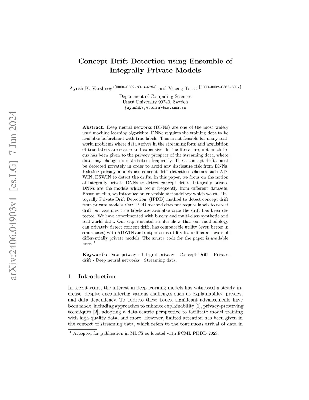 Deep neural networks (DNNs) are one of the most widely used machine learning algorithm. DNNs requires the training data to be available beforehand with true labels. This is not feasible for many real-world problems where data arrives in the streaming form and acquisition of true labels are scarce and expensive. In the literature, not much focus has been given to the privacy prospect of the streaming data, where data may change its distribution frequently. These concept drifts must be detected privately in order to avoid any disclosure risk from DNNs. Existing privacy models use concept drift detection schemes such ADWIN, KSWIN to detect the drifts. In this paper, we focus on the notion of integrally private DNNs to detect concept drifts. Integrally private DNNs are the models which recur frequently from different datasets. Based on this, we introduce an ensemble methodology which we call Íntegrally Private Drift Detection' (IPDD) method to detect concept drift from private models. Our IPDD method does not require labels to detect drift but assumes true labels are available once the drift has been detected. We have experimented with binary and multi-class synthetic and real-world data. Our experimental results show that our methodology can privately detect concept drift, has comparable utility (even better in some cases) with ADWIN and outperforms utility from different levels of differentially private models. The source code for the paper is available \hyperlink{https://github.com/Ayush-Umu/Concept-drift-detection-Using-Integrally-private-models}{here}.