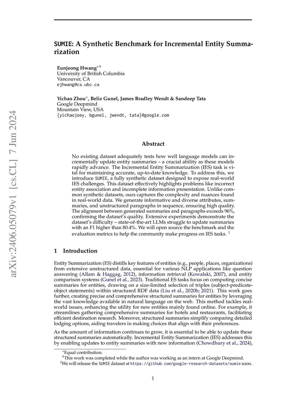 No existing dataset adequately tests how well language models can incrementally update entity summaries - a crucial ability as these models rapidly advance. The Incremental Entity Summarization (IES) task is vital for maintaining accurate, up-to-date knowledge. To address this, we introduce SUMIE, a fully synthetic dataset designed to expose real-world IES challenges. This dataset effectively highlights problems like incorrect entity association and incomplete information presentation. Unlike common synthetic datasets, ours captures the complexity and nuances found in real-world data. We generate informative and diverse attributes, summaries, and unstructured paragraphs in sequence, ensuring high quality. The alignment between generated summaries and paragraphs exceeds 96%, confirming the dataset's quality. Extensive experiments demonstrate the dataset's difficulty - state-of-the-art LLMs struggle to update summaries with an F1 higher than 80.4%. We will open source the benchmark and the evaluation metrics to help the community make progress on IES tasks.