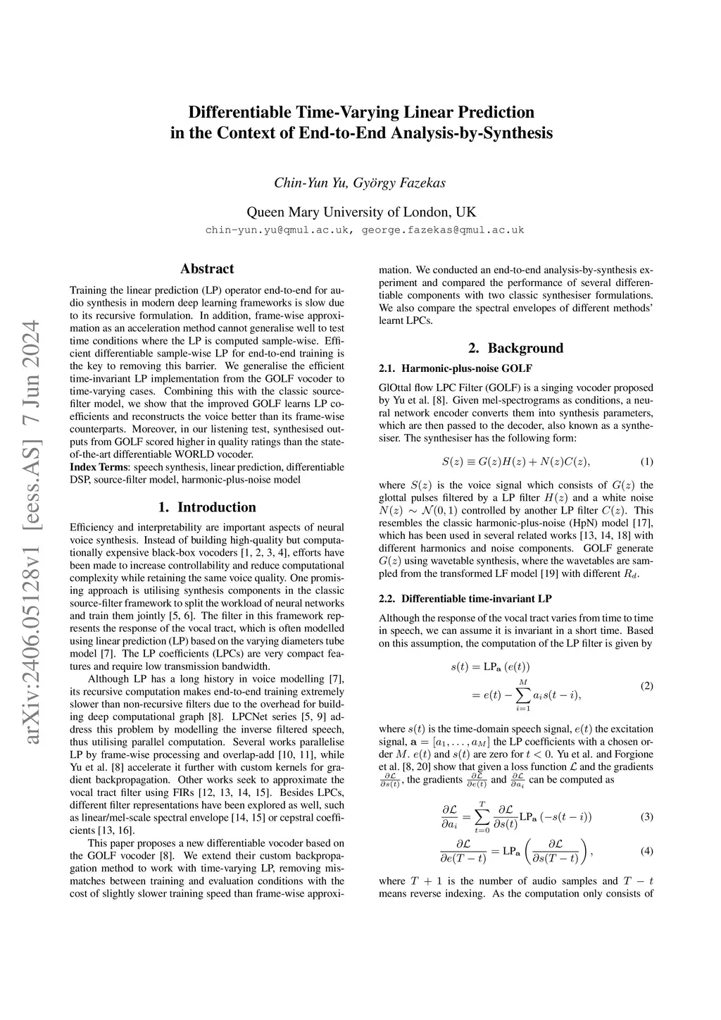 Training the linear prediction (LP) operator end-to-end for audio synthesis in modern deep learning frameworks is slow due to its recursive formulation. In addition, frame-wise approximation as an acceleration method cannot generalise well to test time conditions where the LP is computed sample-wise. Efficient differentiable sample-wise LP for end-to-end training is the key to removing this barrier. We generalise the efficient time-invariant LP implementation from the GOLF vocoder to time-varying cases. Combining this with the classic source-filter model, we show that the improved GOLF learns LP coefficients and reconstructs the voice better than its frame-wise counterparts. Moreover, in our listening test, synthesised outputs from GOLF scored higher in quality ratings than the state-of-the-art differentiable WORLD vocoder.