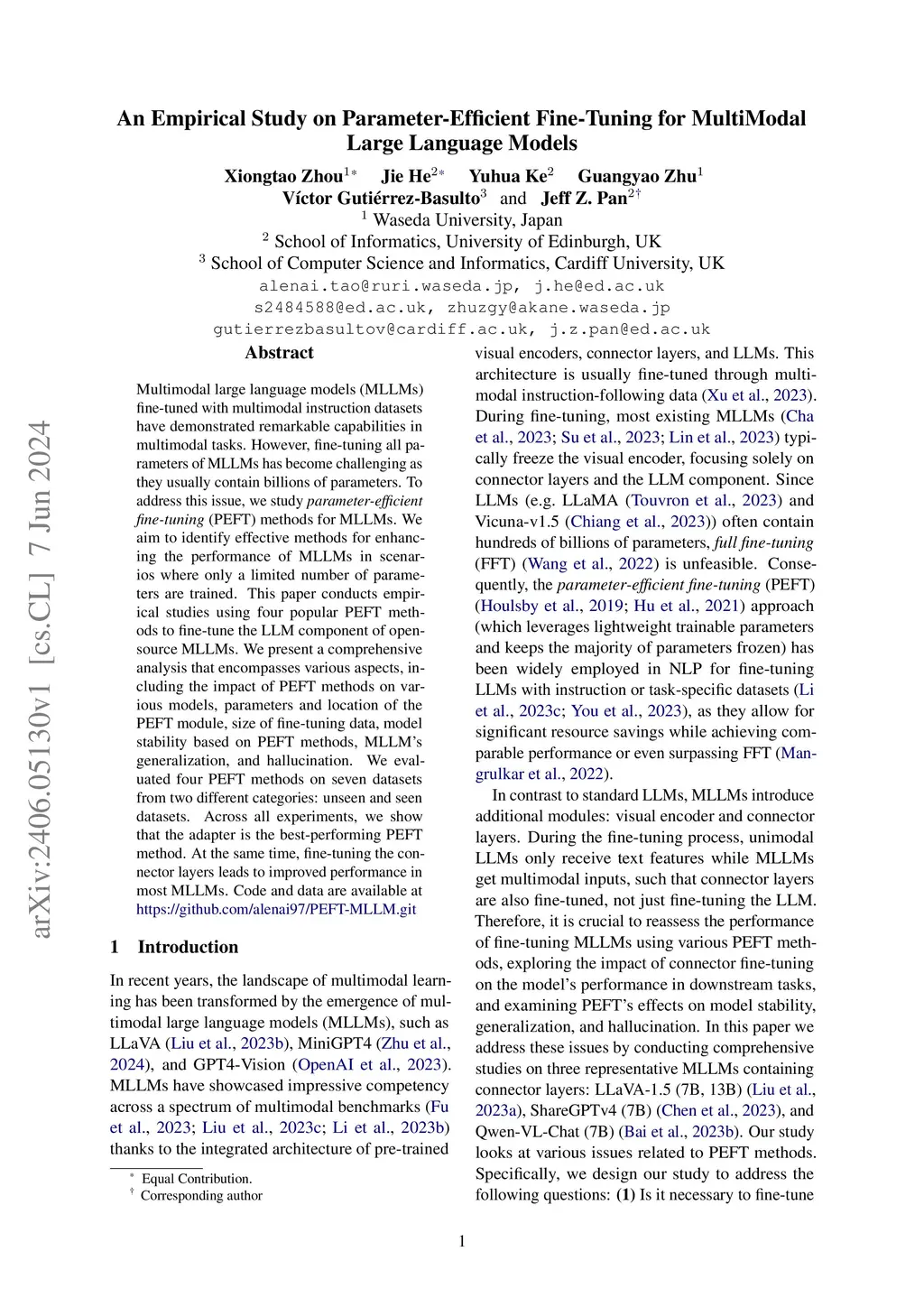Multimodal large language models (MLLMs) fine-tuned with multimodal instruction datasets have demonstrated remarkable capabilities in multimodal tasks. However, fine-tuning all parameters of MLLMs has become challenging as they usually contain billions of parameters. To address this issue, we study parameter-efficient fine-tuning (PEFT) methods for MLLMs. We aim to identify effective methods for enhancing the performance of MLLMs in scenarios where only a limited number of parameters are trained. This paper conducts empirical studies using four popular PEFT methods to fine-tune the LLM component of open-source MLLMs. We present a comprehensive analysis that encompasses various aspects, including the impact of PEFT methods on various models, parameters and location of the PEFT module, size of fine-tuning data, model stability based on PEFT methods, MLLM's generalization, and hallucination. We evaluated four PEFT methods on seven datasets from two different categories: unseen and seen datasets. Across all experiments, we show that the adapter is the best-performing PEFT method. At the same time, fine-tuning the connector layers leads to improved performance in most MLLMs. Code and data are available at https://github.com/alenai97/PEFT-MLLM.git.