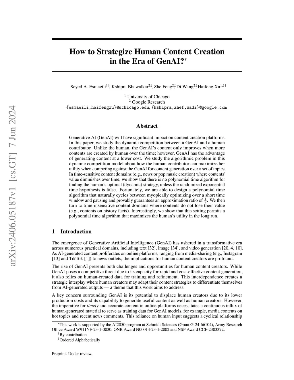 Generative AI (GenAI) will have significant impact on content creation platforms. In this paper, we study the dynamic competition between a GenAI and a human contributor. Unlike the human, the GenAI's content only improves when more contents are created by the human over time; however, GenAI has the advantage of generating content at a lower cost. We study the algorithmic problem in this dynamic competition model about how the human contributor can maximize her utility when competing against the GenAI for content generation over a set of topics. In time-sensitive content domains (e.g., news or pop music creation) where contents' value diminishes over time, we show that there is no polynomial time algorithm for finding the human's optimal (dynamic) strategy, unless the randomized exponential time hypothesis is false. Fortunately, we are able to design a polynomial time algorithm that naturally cycles between myopically optimizing over a short time window and pausing and provably guarantees an approximation ratio of . We then turn to time-insensitive content domains where contents do not lose their value (e.g., contents on history facts). Interestingly, we show that this setting permits a polynomial time algorithm that maximizes the human's utility in the long run. Finally, we conduct simulations that demonstrate the advantage of our algorithms in comparison to a collection of baselines.