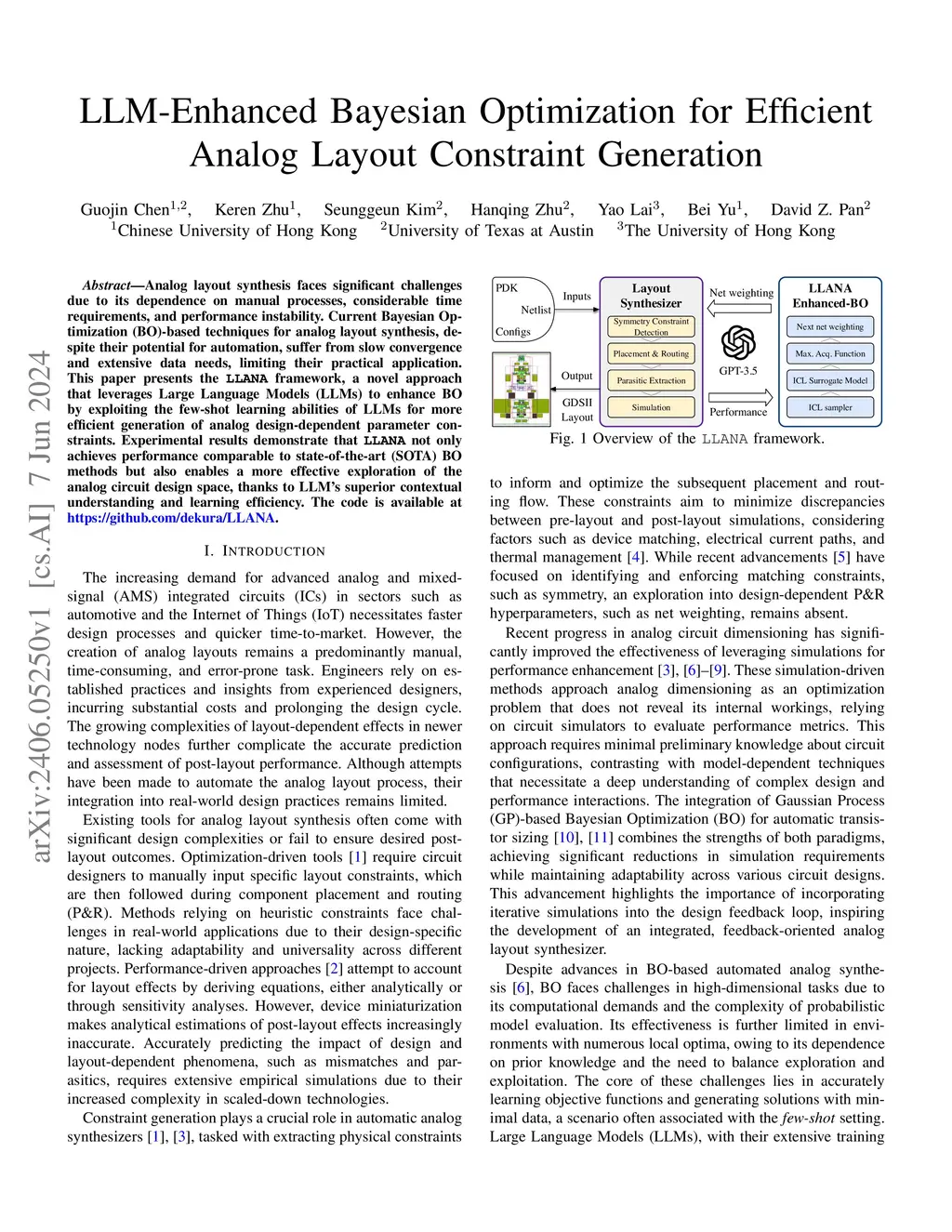 Analog layout synthesis faces significant challenges due to its dependence on manual processes, considerable time requirements, and performance instability. Current Bayesian Optimization (BO)-based techniques for analog layout synthesis, despite their potential for automation, suffer from slow convergence and extensive data needs, limiting their practical application. This paper presents the \texttt{LLANA} framework, a novel approach that leverages Large Language Models (LLMs) to enhance BO by exploiting the few-shot learning abilities of LLMs for more efficient generation of analog design-dependent parameter constraints. Experimental results demonstrate that \texttt{LLANA} not only achieves performance comparable to state-of-the-art (SOTA) BO methods but also enables a more effective exploration of the analog circuit design space, thanks to LLM's superior contextual understanding and learning efficiency. The code is available at https://github.com/dekura/LLANA.