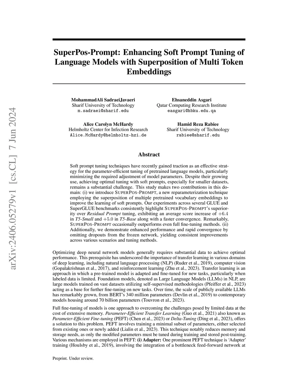 Soft prompt tuning techniques have recently gained traction as an effective strategy for the parameter-efficient tuning of pretrained language models, particularly minimizing the required adjustment of model parameters. Despite their growing use, achieving optimal tuning with soft prompts, especially for smaller datasets, remains a substantial challenge. This study makes two contributions in this domain: (i) we introduce SuperPos-Prompt, a new reparameterization technique employing the superposition of multiple pretrained vocabulary embeddings to improve the learning of soft prompts. Our experiments across several GLUE and SuperGLUE benchmarks consistently highlight SuperPos-Prompt's superiority over Residual Prompt tuning, exhibiting an average score increase of in T5-Small and in T5-Base along with a faster convergence. Remarkably, SuperPos-Prompt occasionally outperforms even full fine-tuning methods. (ii) Additionally, we demonstrate enhanced performance and rapid convergence by omitting dropouts from the frozen network, yielding consistent improvements across various scenarios and tuning methods.