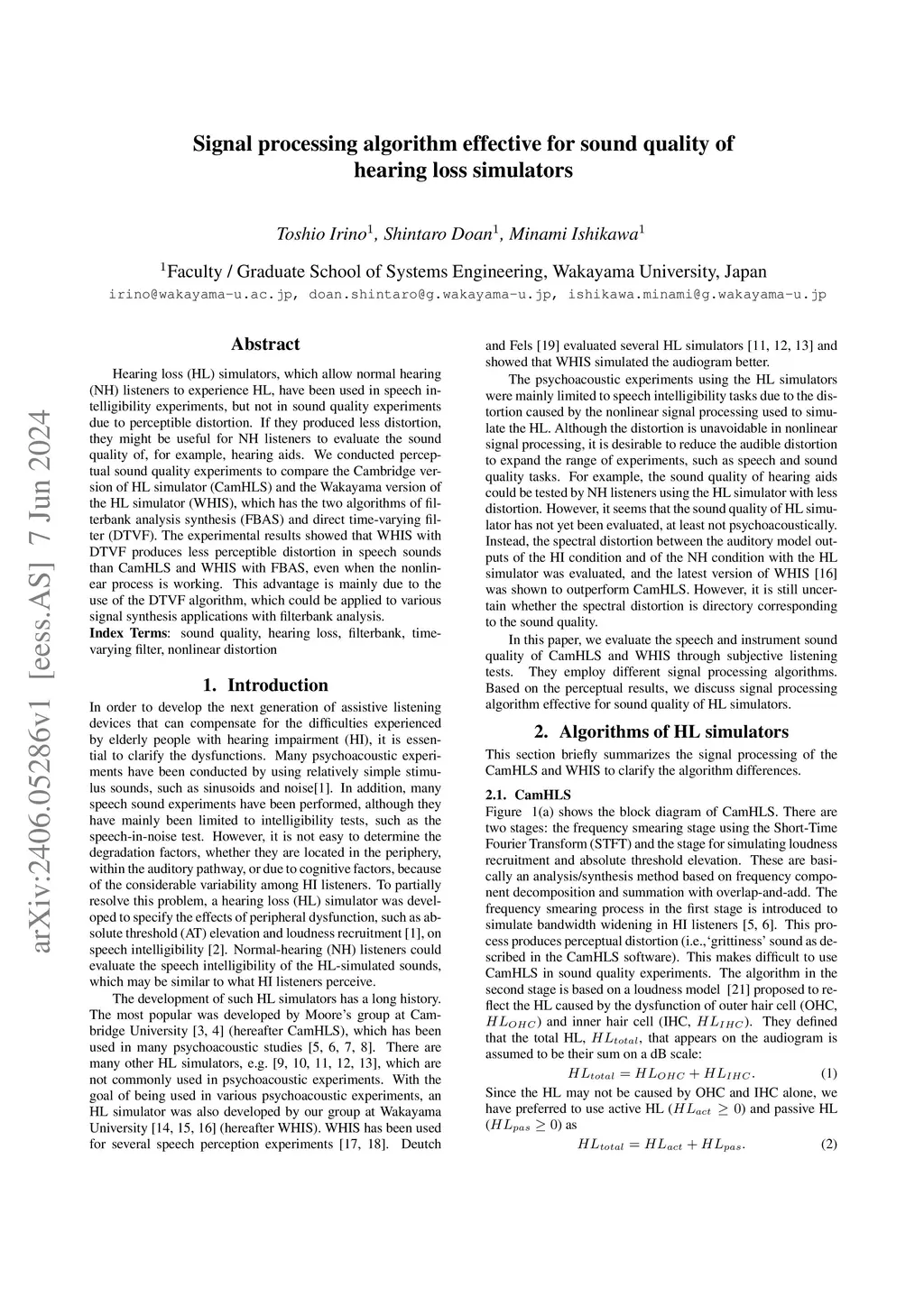 Hearing loss (HL) simulators, which allow normal hearing (NH) listeners to experience HL, have been used in speech intelligibility experiments, but not in sound quality experiments due to perceptible distortion. If they produced less distortion, they might be useful for NH listeners to evaluate the sound quality of, for example, hearing aids. We conducted perceptual sound quality experiments to compare the Cambridge version of HL simulator (CamHLS) and the Wakayama version of the HL simulator (WHIS), which has the two algorithms of filterbank analysis synthesis (FBAS) and direct time-varying filter (DTVF). The experimental results showed that WHIS with DTVF produces less perceptible distortion in speech sounds than CamHLS and WHIS with FBAS, even when the nonlinear process is working. This advantage is mainly due to the use of the DTVF algorithm, which could be applied to various signal synthesis applications with filterbank analysis.