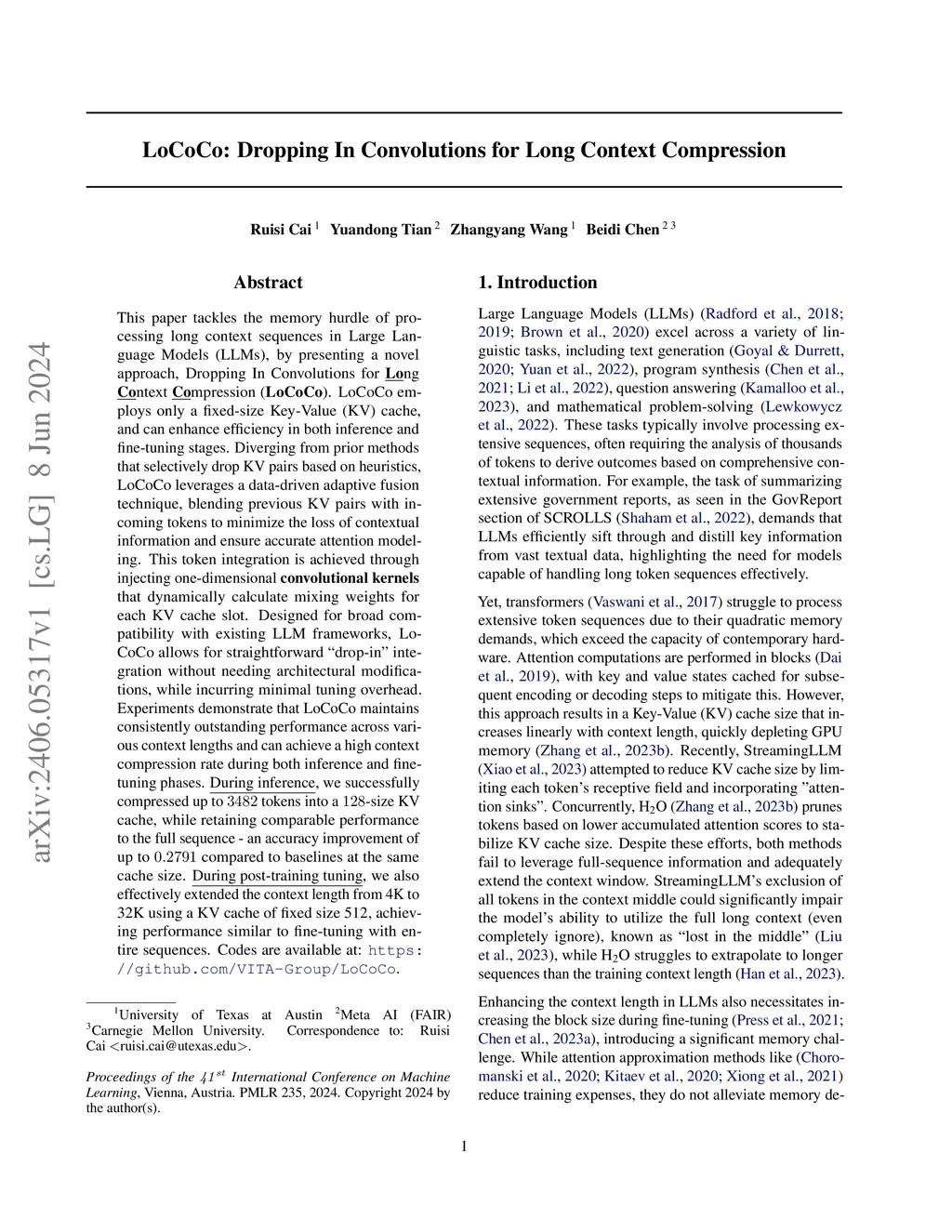 This paper tackles the memory hurdle of processing long context sequences in Large Language Models (LLMs), by presenting a novel approach, Dropping In Convolutions for Long Context Compression (LoCoCo). LoCoCo employs only a fixed-size Key-Value (KV) cache, and can enhance efficiency in both inference and fine-tuning stages. Diverging from prior methods that selectively drop KV pairs based on heuristics, LoCoCo leverages a data-driven adaptive fusion technique, blending previous KV pairs with incoming tokens to minimize the loss of contextual information and ensure accurate attention modeling. This token integration is achieved through injecting one-dimensional convolutional kernels that dynamically calculate mixing weights for each KV cache slot. Designed for broad compatibility with existing LLM frameworks, LoCoCo allows for straightforward "drop-in" integration without needing architectural modifications, while incurring minimal tuning overhead. Experiments demonstrate that LoCoCo maintains consistently outstanding performance across various context lengths and can achieve a high context compression rate during both inference and fine-tuning phases. During inference, we successfully compressed up to 3482 tokens into a 128-size KV cache, while retaining comparable performance to the full sequence - an accuracy improvement of up to 0.2791 compared to baselines at the same cache size. During post-training tuning, we also effectively extended the context length from 4K to 32K using a KV cache of fixed size 512, achieving performance similar to fine-tuning with entire sequences.