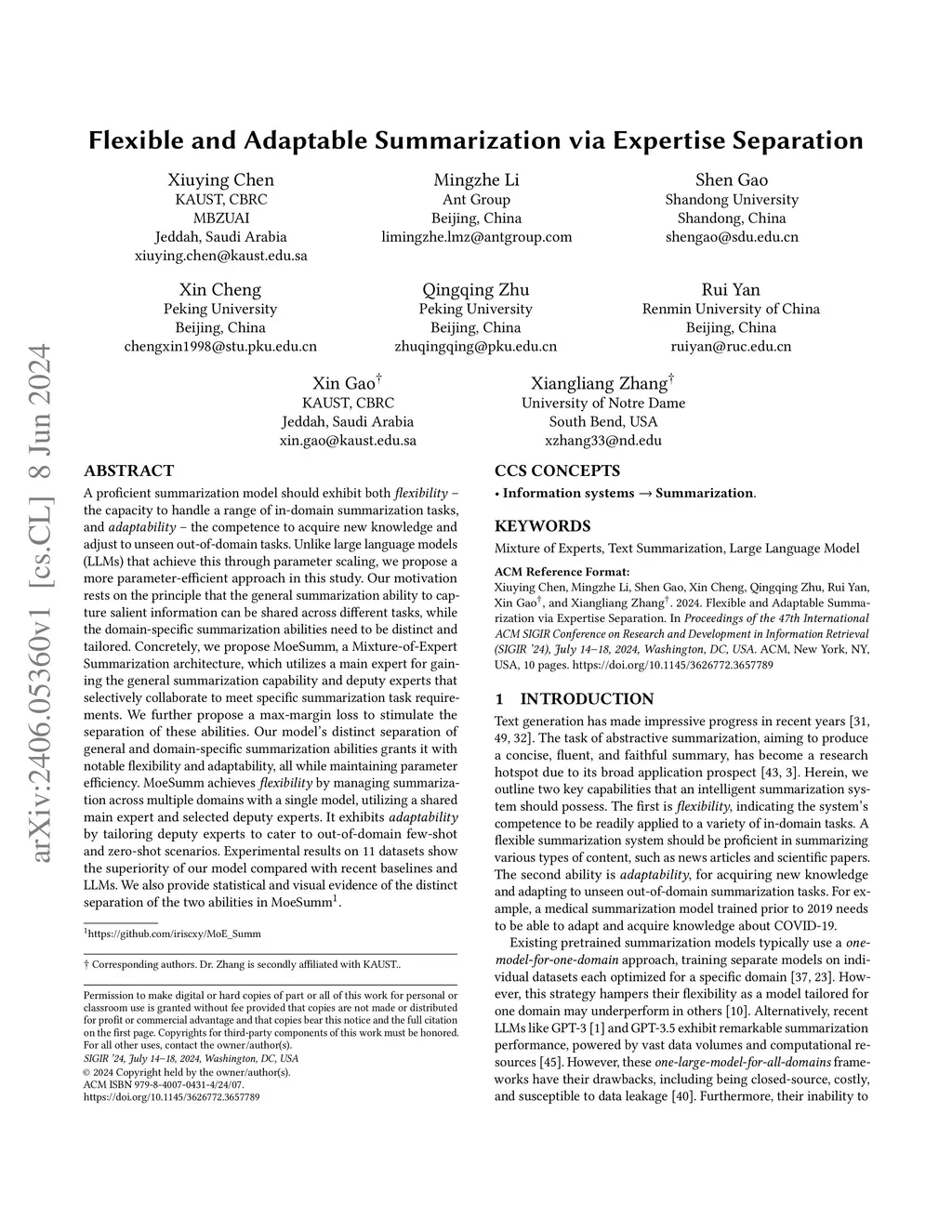 A proficient summarization model should exhibit both flexibility -- the capacity to handle a range of in-domain summarization tasks, and adaptability -- the competence to acquire new knowledge and adjust to unseen out-of-domain tasks. Unlike large language models (LLMs) that achieve this through parameter scaling, we propose a more parameter-efficient approach in this study. Our motivation rests on the principle that the general summarization ability to capture salient information can be shared across different tasks, while the domain-specific summarization abilities need to be distinct and tailored. Concretely, we propose MoeSumm, a Mixture-of-Expert Summarization architecture, which utilizes a main expert for gaining the general summarization capability and deputy experts that selectively collaborate to meet specific summarization task requirements. We further propose a max-margin loss to stimulate the separation of these abilities. Our model's distinct separation of general and domain-specific summarization abilities grants it with notable flexibility and adaptability, all while maintaining parameter efficiency. MoeSumm achieves flexibility by managing summarization across multiple domains with a single model, utilizing a shared main expert and selected deputy experts. It exhibits adaptability by tailoring deputy experts to cater to out-of-domain few-shot and zero-shot scenarios. Experimental results on 11 datasets show the superiority of our model compared with recent baselines and LLMs. We also provide statistical and visual evidence of the distinct separation of the two abilities in MoeSumm (https://github.com/iriscxy/MoE_Summ).