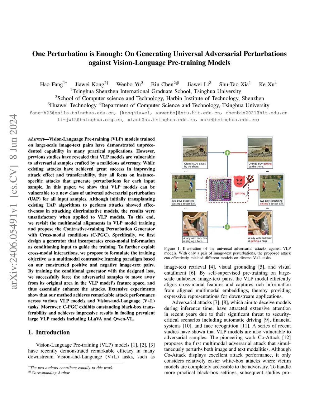 Vision-Language Pre-training (VLP) models have exhibited unprecedented capability in many applications by taking full advantage of the multimodal alignment. However, previous studies have shown they are vulnerable to maliciously crafted adversarial samples. Despite recent success, these methods are generally instance-specific and require generating perturbations for each input sample. In this paper, we reveal that VLP models are also vulnerable to the instance-agnostic universal adversarial perturbation (UAP). Specifically, we design a novel Contrastive-training Perturbation Generator with Cross-modal conditions (C-PGC) to achieve the attack. In light that the pivotal multimodal alignment is achieved through the advanced contrastive learning technique, we devise to turn this powerful weapon against themselves, i.e., employ a malicious version of contrastive learning to train the C-PGC based on our carefully crafted positive and negative image-text pairs for essentially destroying the alignment relationship learned by VLP models. Besides, C-PGC fully utilizes the characteristics of Vision-and-Language (V+L) scenarios by incorporating both unimodal and cross-modal information as effective guidance. Extensive experiments show that C-PGC successfully forces adversarial samples to move away from their original area in the VLP model's feature space, thus essentially enhancing attacks across various victim models and V+L tasks. The GitHub repository is available atthis https URL.