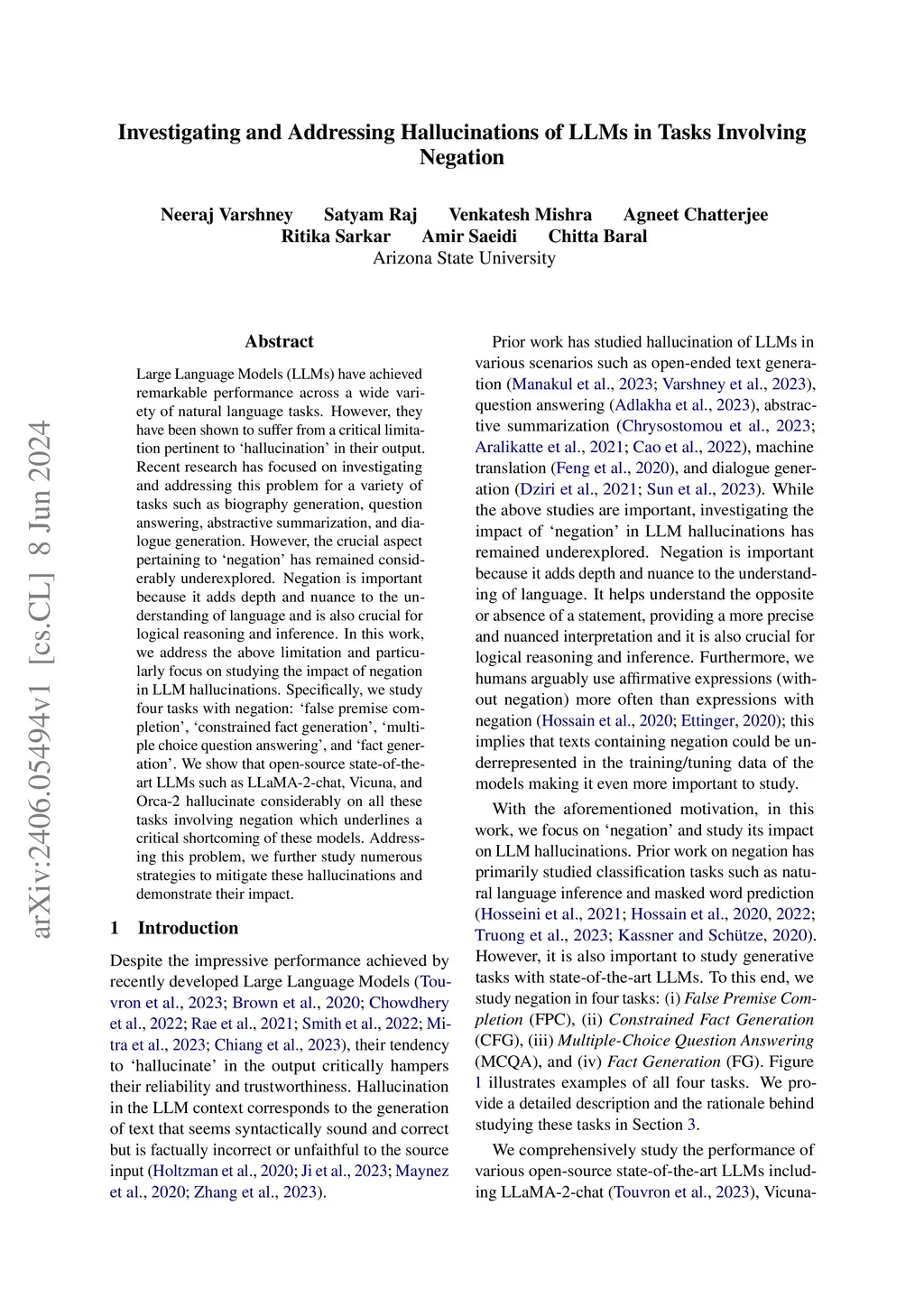 Large Language Models (LLMs) have achieved remarkable performance across a wide variety of natural language tasks. However, they have been shown to suffer from a critical limitation pertinent to 'hallucination' in their output. Recent research has focused on investigating and addressing this problem for a variety of tasks such as biography generation, question answering, abstractive summarization, and dialogue generation. However, the crucial aspect pertaining to ñegation' has remained considerably underexplored. Negation is important because it adds depth and nuance to the understanding of language and is also crucial for logical reasoning and inference. In this work, we address the above limitation and particularly focus on studying the impact of negation in LLM hallucinations. Specifically, we study four tasks with negation: 'false premise completion', 'constrained fact generation', 'multiple choice question answering', and 'fact generation'. We show that open-source state-of-the-art LLMs such as LLaMA-2-chat, Vicuna, and Orca-2 hallucinate considerably on all these tasks involving negation which underlines a critical shortcoming of these models. Addressing this problem, we further study numerous strategies to mitigate these hallucinations and demonstrate their impact.