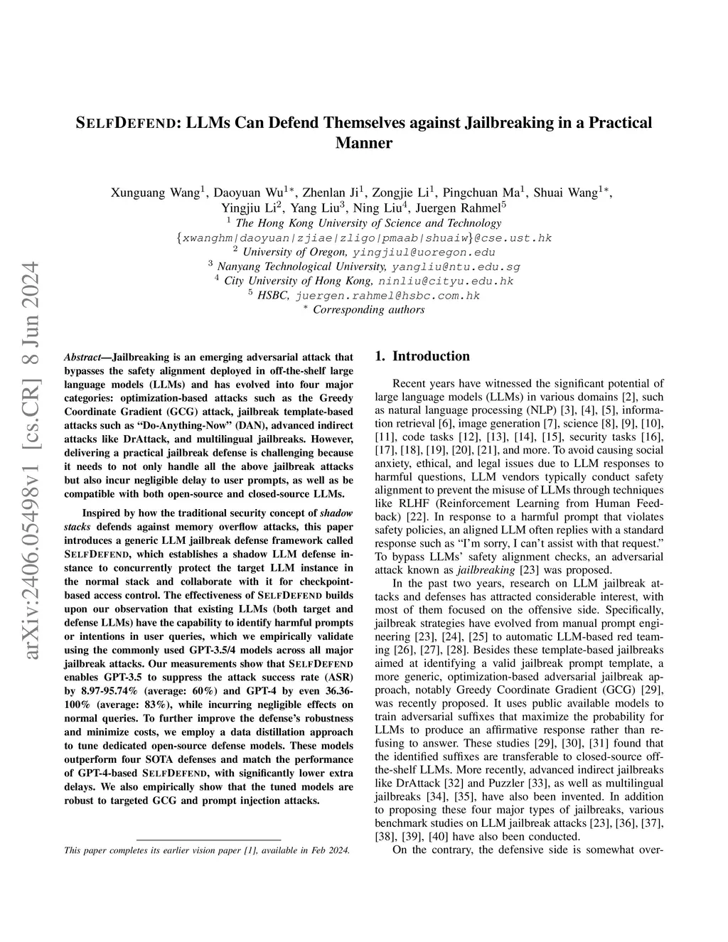 Jailbreaking is an emerging adversarial attack that bypasses the safety alignment deployed in off-the-shelf large language models (LLMs) and has evolved into multiple categories: human-based, optimization-based, generation-based, and the recent indirect and multilingual jailbreaks. However, delivering a practical jailbreak defense is challenging because it needs to not only handle all the above jailbreak attacks but also incur negligible delays to user prompts, as well as be compatible with both open-source and closed-source LLMs. Inspired by how the traditional security concept of shadow stacks defends against memory overflow attacks, this paper introduces a generic LLM jailbreak defense framework called SelfDefend, which establishes a shadow LLM as a defense instance (in detection state) to concurrently protect the target LLM instance (in normal answering state) in the normal stack and collaborate with it for checkpoint-based access control. The effectiveness of SelfDefend builds upon our observation that existing LLMs can identify harmful prompts or intentions in user queries, which we empirically validate using mainstream GPT-3.5/4 models against major jailbreak attacks. To further improve the defense's robustness and minimize costs, we employ a data distillation approach to tune dedicated open-source defense models. When deployed to protect GPT-3.5/4, Claude, Llama-2-7b/13b, and Mistral, these models outperform seven state-of-the-art defenses and match the performance of GPT-4-based SelfDefend, with significantly lower extra delays. Further experiments show that the tuned models are robust to adaptive jailbreaks and prompt injections.
