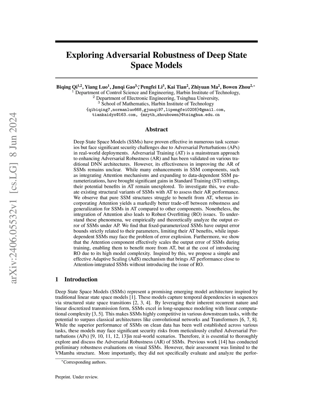 Deep State Space Models (SSMs) have proven effective in numerous task scenarios but face significant security challenges due to Adversarial Perturbations (APs) in real-world deployments. Adversarial Training (AT) is a mainstream approach to enhancing Adversarial Robustness (AR) and has been validated on various traditional DNN architectures. However, its effectiveness in improving the AR of SSMs remains unclear. While many enhancements in SSM components, such as integrating Attention mechanisms and expanding to data-dependent SSM parameterizations, have brought significant gains in Standard Training (ST) settings, their potential benefits in AT remain unexplored. To investigate this, we evaluate existing structural variants of SSMs with AT to assess their AR performance. We observe that pure SSM structures struggle to benefit from AT, whereas incorporating Attention yields a markedly better trade-off between robustness and generalization for SSMs in AT compared to other components. Nonetheless, the integration of Attention also leads to Robust Overfitting (RO) issues. To understand these phenomena, we empirically and theoretically analyze the output error of SSMs under AP. We find that fixed-parameterized SSMs have output error bounds strictly related to their parameters, limiting their AT benefits, while input-dependent SSMs may face the problem of error explosion. Furthermore, we show that the Attention component effectively scales the output error of SSMs during training, enabling them to benefit more from AT, but at the cost of introducing RO due to its high model complexity. Inspired by this, we propose a simple and effective Adaptive Scaling (AdS) mechanism that brings AT performance close to Attention-integrated SSMs without introducing the issue of RO.