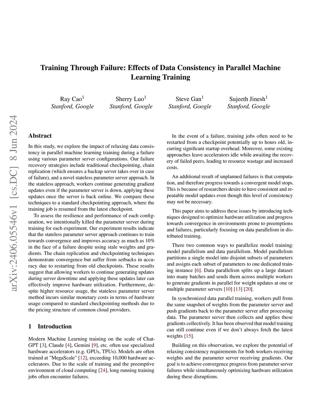 In this study, we explore the impact of relaxing data consistency in parallel machine learning training during a failure using various parameter server configurations. Our failure recovery strategies include traditional checkpointing, chain replication (which ensures a backup server takes over in case of failure), and a novel stateless parameter server approach. In the stateless approach, workers continue generating gradient updates even if the parameter server is down, applying these updates once the server is back online. We compare these techniques to a standard checkpointing approach, where the training job is resumed from the latest checkpoint. To assess the resilience and performance of each configuration, we intentionally killed the parameter server during training for each experiment. Our experiment results indicate that the stateless parameter server approach continues to train towards convergence and improves accuracy as much as 10\% in the face of a failure despite using stale weights and gradients. The chain replication and checkpointing techniques demonstrate convergence but suffer from setbacks in accuracy due to restarting from old checkpoints. These results suggest that allowing workers to continue generating updates during server downtime and applying these updates later can effectively improve hardware utilization. Furthermore, despite higher resource usage, the stateless parameter server method incurs similar monetary costs in terms of hardware usage compared to standard checkpointing methods due to the pricing structure of common cloud providers.