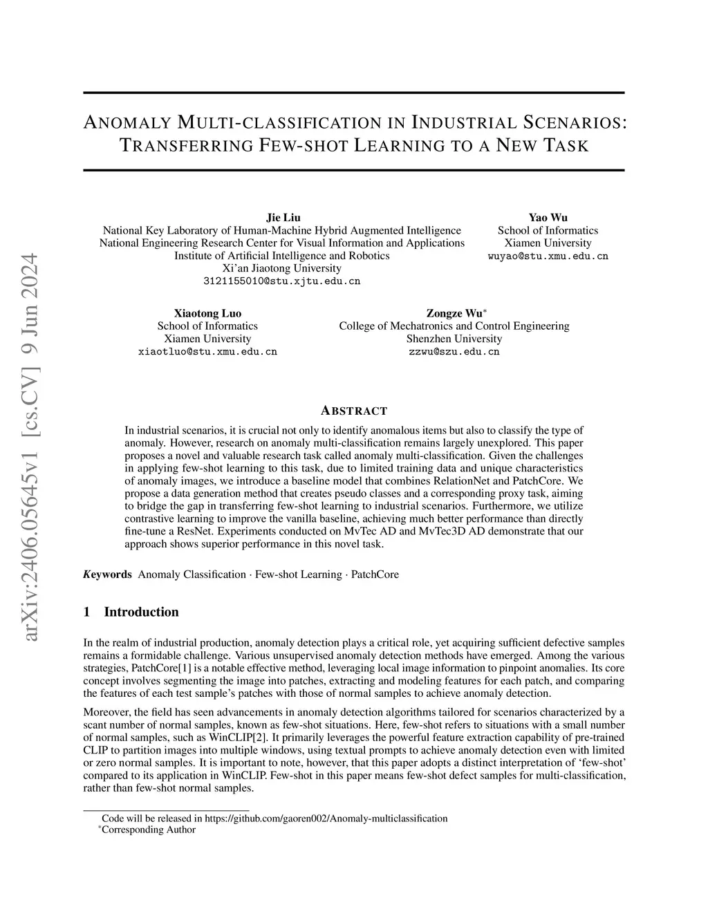 In industrial scenarios, it is crucial not only to identify anomalous items but also to classify the type of anomaly. However, research on anomaly multi-classification remains largely unexplored. This paper proposes a novel and valuable research task called anomaly multi-classification. Given the challenges in applying few-shot learning to this task, due to limited training data and unique characteristics of anomaly images, we introduce a baseline model that combines RelationNet and PatchCore. We propose a data generation method that creates pseudo classes and a corresponding proxy task, aiming to bridge the gap in transferring few-shot learning to industrial scenarios. Furthermore, we utilize contrastive learning to improve the vanilla baseline, achieving much better performance than directly fine-tune a ResNet. Experiments conducted on MvTec AD and MvTec3D AD demonstrate that our approach shows superior performance in this novel task.