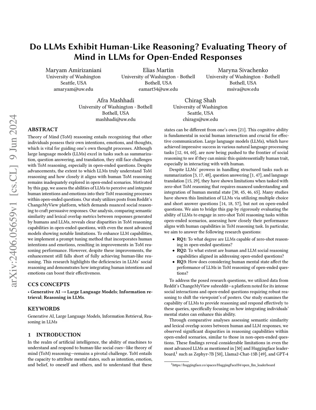 Theory of Mind (ToM) reasoning entails recognizing that other individuals possess their own intentions, emotions, and thoughts, which is vital for guiding one's own thought processes. Although large language models (LLMs) excel in tasks such as summarization, question answering, and translation, they still face challenges with ToM reasoning, especially in open-ended questions. Despite advancements, the extent to which LLMs truly understand ToM reasoning and how closely it aligns with human ToM reasoning remains inadequately explored in open-ended scenarios. Motivated by this gap, we assess the abilities of LLMs to perceive and integrate human intentions and emotions into their ToM reasoning processes within open-ended questions. Our study utilizes posts from Reddit's ChangeMyView platform, which demands nuanced social reasoning to craft persuasive responses. Our analysis, comparing semantic similarity and lexical overlap metrics between responses generated by humans and LLMs, reveals clear disparities in ToM reasoning capabilities in open-ended questions, with even the most advanced models showing notable limitations. To enhance LLM capabilities, we implement a prompt tuning method that incorporates human intentions and emotions, resulting in improvements in ToM reasoning performance. However, despite these improvements, the enhancement still falls short of fully achieving human-like reasoning. This research highlights the deficiencies in LLMs' social reasoning and demonstrates how integrating human intentions and emotions can boost their effectiveness.