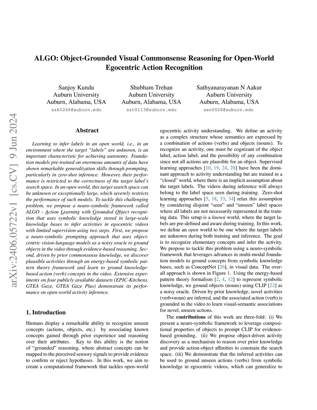 Learning to infer labels in an open world, i.e., in an environment where the target "labels" are unknown, is an important characteristic for achieving autonomy. Foundation models pre-trained on enormous amounts of data have shown remarkable generalization skills through prompting, particularly in zero-shot inference. However, their performance is restricted to the correctness of the target label's search space. In an open world, this target search space can be unknown or exceptionally large, which severely restricts the performance of such models. To tackle this challenging problem, we propose a neuro-symbolic framework called ALGO - Action Learning with Grounded Object recognition that uses symbolic knowledge stored in large-scale knowledge bases to infer activities in egocentric videos with limited supervision using two steps. First, we propose a neuro-symbolic prompting approach that uses object-centric vision-language models as a noisy oracle to ground objects in the video through evidence-based reasoning. Second, driven by prior commonsense knowledge, we discover plausible activities through an energy-based symbolic pattern theory framework and learn to ground knowledge-based action (verb) concepts in the video. Extensive experiments on four publicly available datasets (EPIC-Kitchens, GTEA Gaze, GTEA Gaze Plus) demonstrate its performance on open-world activity inference.