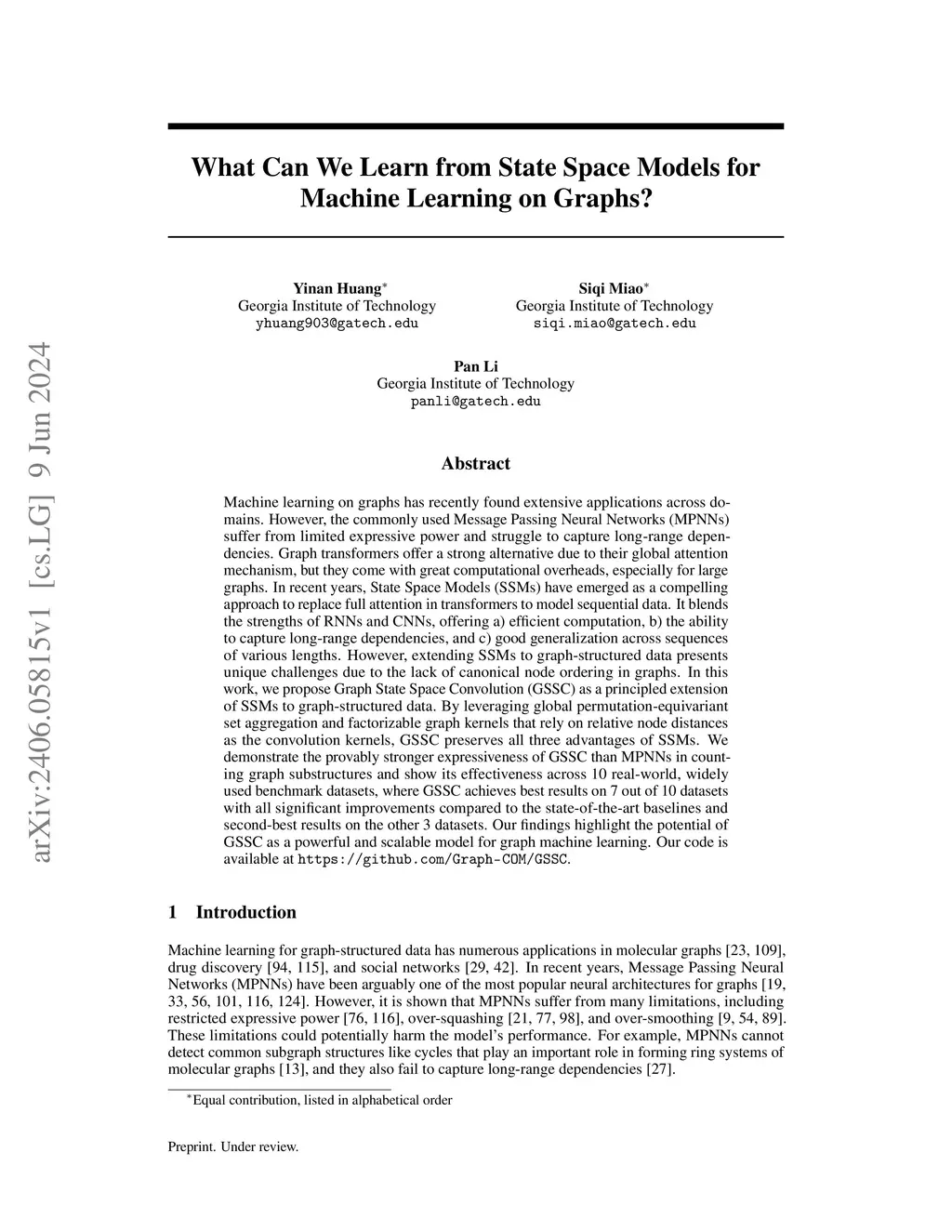 Machine learning on graphs has recently found extensive applications across domains. However, the commonly used Message Passing Neural Networks (MPNNs) suffer from limited expressive power and struggle to capture long-range dependencies. Graph transformers offer a strong alternative due to their global attention mechanism, but they come with great computational overheads, especially for large graphs. In recent years, State Space Models (SSMs) have emerged as a compelling approach to replace full attention in transformers to model sequential data. It blends the strengths of RNNs and CNNs, offering a) efficient computation, b) the ability to capture long-range dependencies, and c) good generalization across sequences of various lengths. However, extending SSMs to graph-structured data presents unique challenges due to the lack of canonical node ordering in graphs. In this work, we propose Graph State Space Convolution (GSSC) as a principled extension of SSMs to graph-structured data. By leveraging global permutation-equivariant set aggregation and factorizable graph kernels that rely on relative node distances as the convolution kernels, GSSC preserves all three advantages of SSMs. We demonstrate the provably stronger expressiveness of GSSC than MPNNs in counting graph substructures and show its effectiveness across 10 real-world, widely used benchmark datasets, where GSSC achieves best results on 7 out of 10 datasets with all significant improvements compared to the state-of-the-art baselines and second-best results on the other 3 datasets. Our findings highlight the potential of GSSC as a powerful and scalable model for graph machine learning. Our code is available at https://github.com/Graph-COM/GSSC.