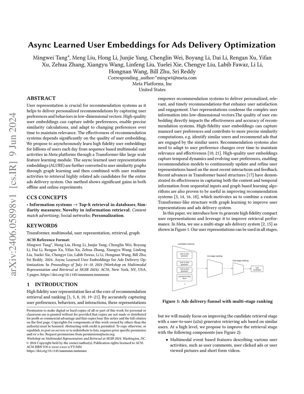 In recommendation systems, high-quality user embeddings can capture subtle preferences, enable precise similarity calculations, and adapt to changing preferences over time to maintain relevance. The effectiveness of recommendation systems depends on the quality of user embedding. We propose to asynchronously learn high fidelity user embeddings for billions of users each day from sequence based multimodal user activities through a Transformer-like large scale feature learning module. The async learned user representations embeddings (ALURE) are further converted to user similarity graphs through graph learning and then combined with user realtime activities to retrieval highly related ads candidates for the ads delivery system. Our method shows significant gains in both offline and online experiments.