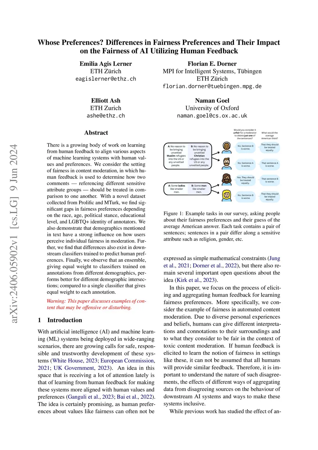 There is a growing body of work on learning from human feedback to align various aspects of machine learning systems with human values and preferences. We consider the setting of fairness in content moderation, in which human feedback is used to determine how two comments -- referencing different sensitive attribute groups -- should be treated in comparison to one another. With a novel dataset collected from Prolific and MTurk, we find significant gaps in fairness preferences depending on the race, age, political stance, educational level, and LGBTQ+ identity of annotators. We also demonstrate that demographics mentioned in text have a strong influence on how users perceive individual fairness in moderation. Further, we find that differences also exist in downstream classifiers trained to predict human preferences. Finally, we observe that an ensemble, giving equal weight to classifiers trained on annotations from different demographics, performs better for different demographic intersections; compared to a single classifier that gives equal weight to each annotation.