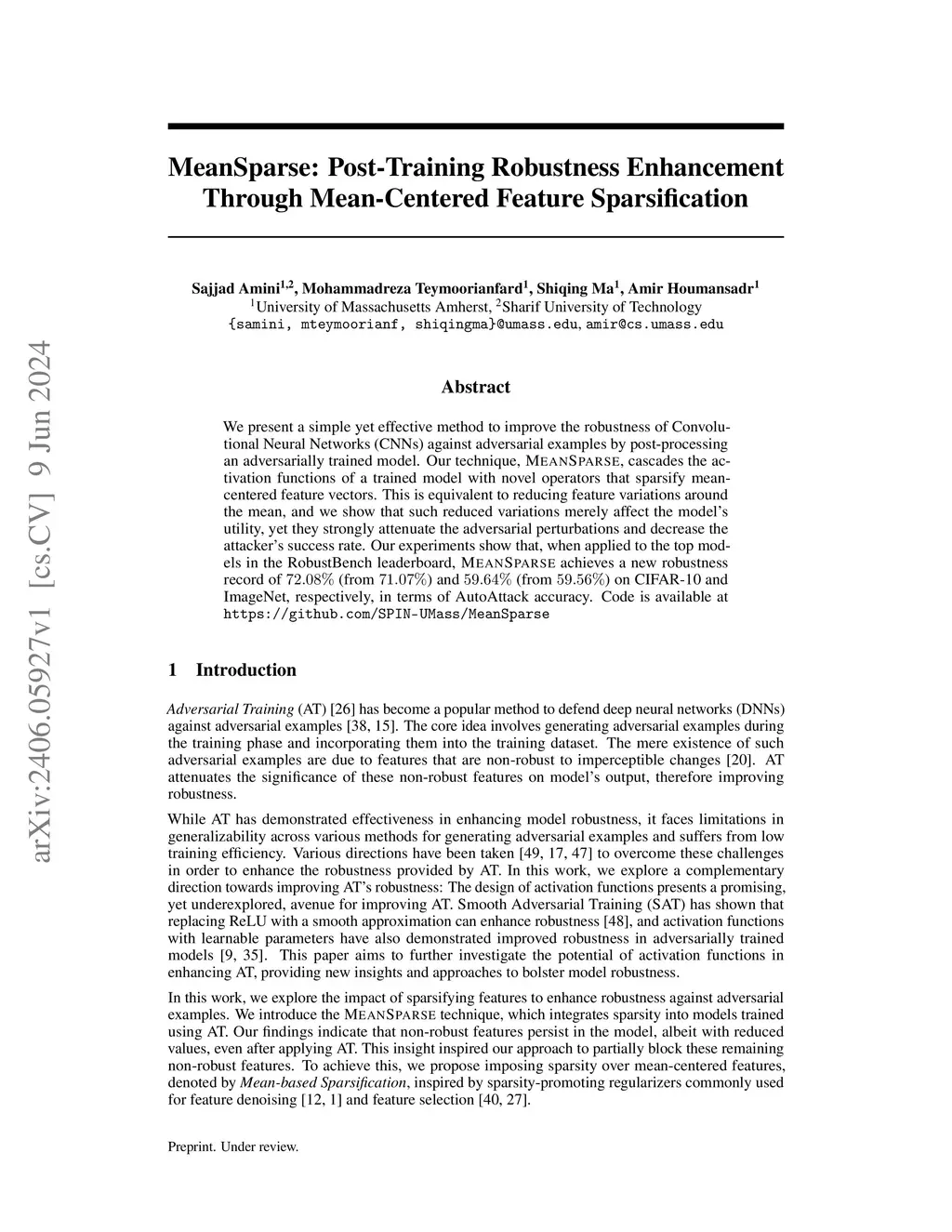 We present a simple yet effective method to improve the robustness of both Convolutional and attention-based Neural Networks against adversarial examples by post-processing an adversarially trained model. Our technique, MeanSparse, cascades the activation functions of a trained model with novel operators that sparsify mean-centered feature vectors. This is equivalent to reducing feature variations around the mean, and we show that such reduced variations merely affect the model's utility, yet they strongly attenuate the adversarial perturbations and decrease the attacker's success rate. Our experiments show that, when applied to the top models in the RobustBench leaderboard, MeanSparse achieves a new robustness record of 75.28% (from 73.71%), 44.78% (from 42.67%) and 62.12% (from 59.56%) on CIFAR-10, CIFAR-100 and ImageNet, respectively, in terms of AutoAttack accuracy. Code is available atthis https URL