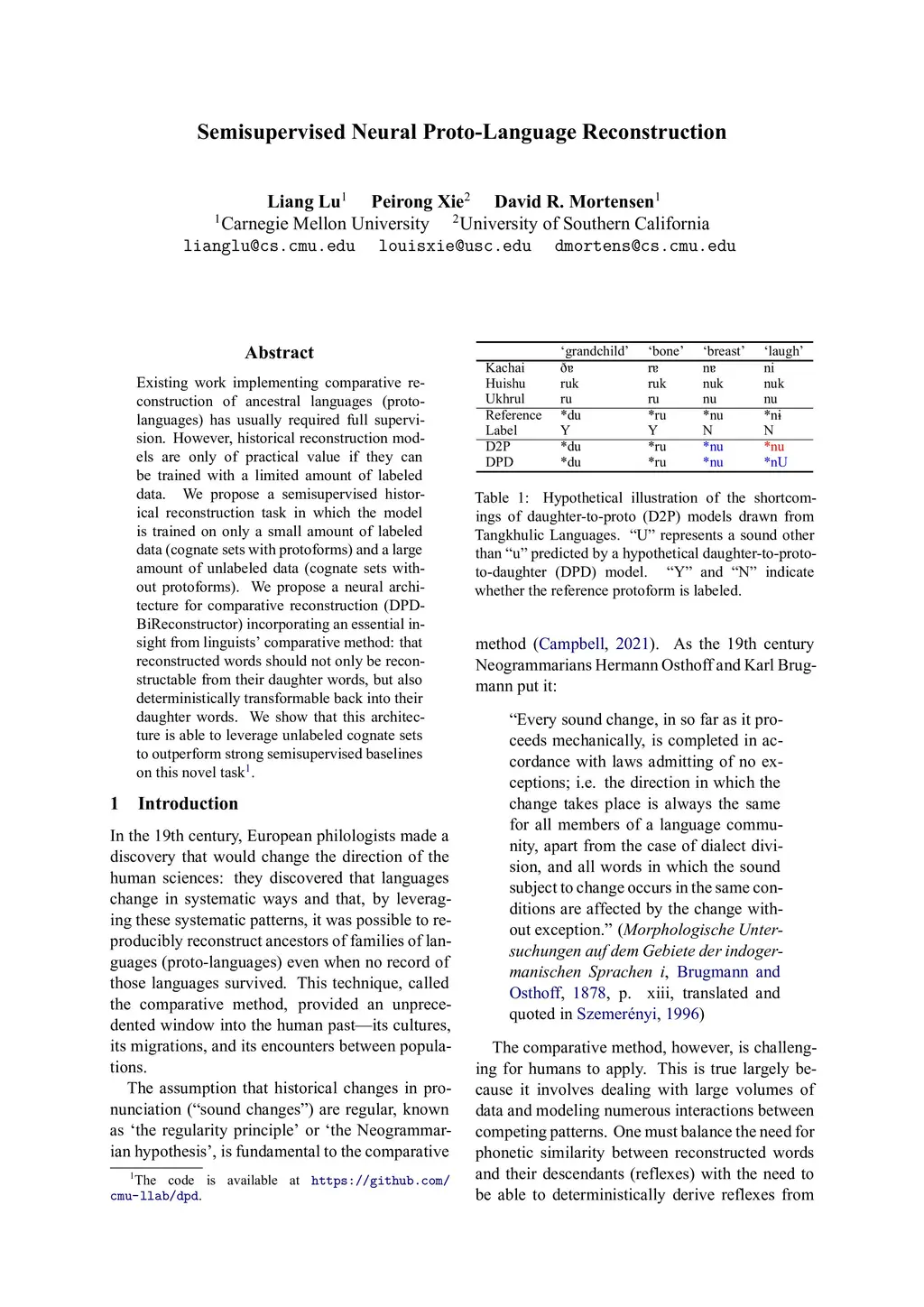 Existing work implementing comparative reconstruction of ancestral languages (proto-languages) has usually required full supervision. However, historical reconstruction models are only of practical value if they can be trained with a limited amount of labeled data. We propose a semisupervised historical reconstruction task in which the model is trained on only a small amount of labeled data (cognate sets with proto-forms) and a large amount of unlabeled data (cognate sets without proto-forms). We propose a neural architecture for comparative reconstruction (DPD-BiReconstructor) incorporating an essential insight from linguists' comparative method: that reconstructed words should not only be reconstructable from their daughter words, but also deterministically transformable back into their daughter words. We show that this architecture is able to leverage unlabeled cognate sets to outperform strong semisupervised baselines on this novel task.