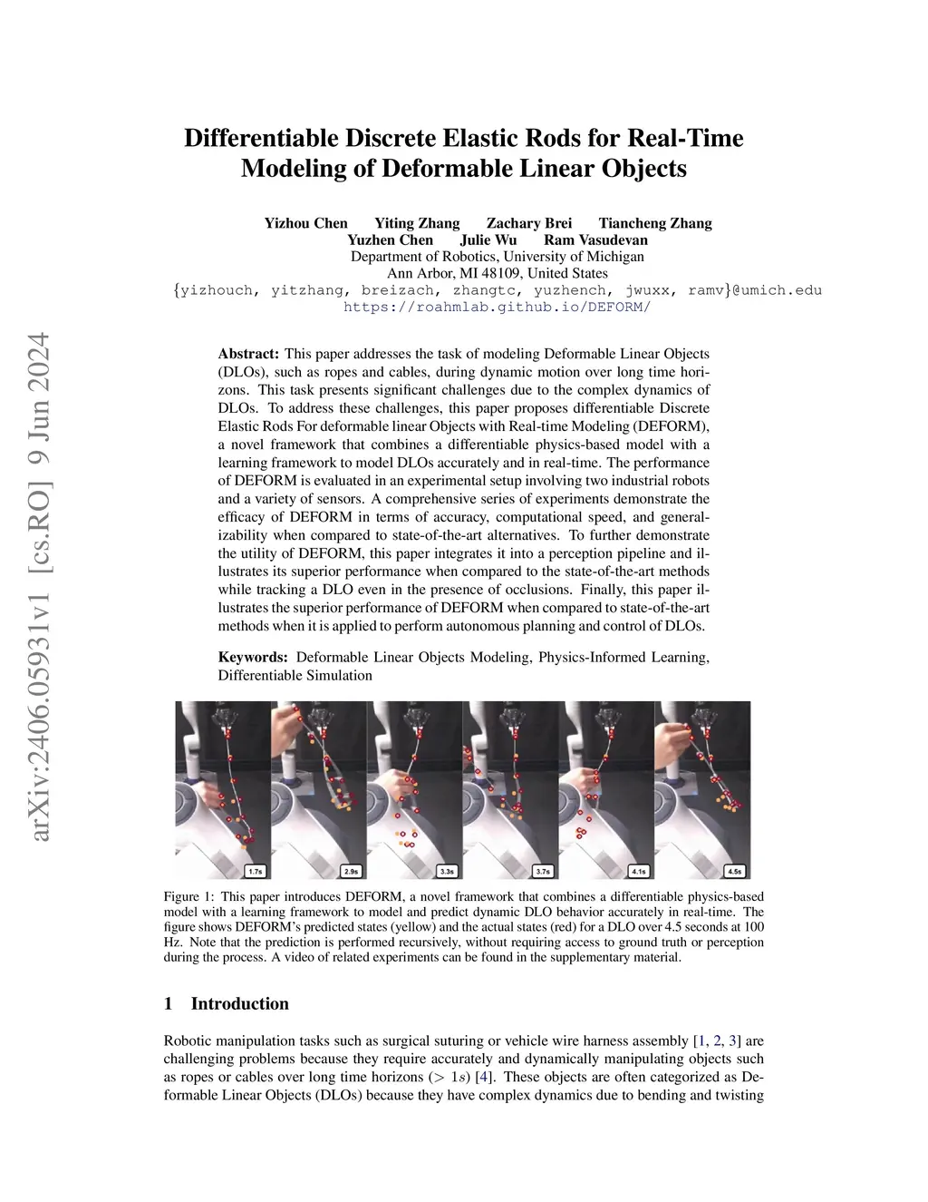 This paper addresses the task of modeling Deformable Linear Objects (DLOs), such as ropes and cables, during dynamic motion over long time horizons. This task presents significant challenges due to the complex dynamics of DLOs. To address these challenges, this paper proposes differentiable Discrete Elastic Rods For deformable linear Objects with Real-time Modeling (DEFORM), a novel framework that combines a differentiable physics-based model with a learning framework to model DLOs accurately and in real-time. The performance of DEFORM is evaluated in an experimental setup involving two industrial robots and a variety of sensors. A comprehensive series of experiments demonstrate the efficacy of DEFORM in terms of accuracy, computational speed, and generalizability when compared to state-of-the-art alternatives. To further demonstrate the utility of DEFORM, this paper integrates it into a perception pipeline and illustrates its superior performance when compared to the state-of-the-art methods while tracking a DLO even in the presence of occlusions. Finally, this paper illustrates the superior performance of DEFORM when compared to state-of-the-art methods when it is applied to perform autonomous planning and control of DLOs. Project page:this https URL.