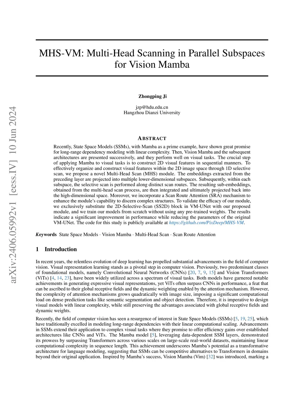 Recently, State Space Models (SSMs), with Mamba as a prime example, have shown great promise for long-range dependency modeling with linear complexity. Then, Vision Mamba and the subsequent architectures are presented successively, and they perform well on visual tasks. The crucial step of applying Mamba to visual tasks is to construct 2D visual features in sequential manners. To effectively organize and construct visual features within the 2D image space through 1D selective scan, we propose a novel Multi-Head Scan (MHS) module. The embeddings extracted from the preceding layer are projected into multiple lower-dimensional subspaces. Subsequently, within each subspace, the selective scan is performed along distinct scan routes. The resulting sub-embeddings, obtained from the multi-head scan process, are then integrated and ultimately projected back into the high-dimensional space. Moreover, we incorporate a Scan Route Attention (SRA) mechanism to enhance the module's capability to discern complex structures. To validate the efficacy of our module, we exclusively substitute the 2D-Selective-Scan (SS2D) block in VM-UNet with our proposed module, and we train our models from scratch without using any pre-trained weights. The results indicate a significant improvement in performance while reducing the parameters of the original VM-UNet. The code for this study is publicly available at https://github.com/PixDeep/MHS-VM.