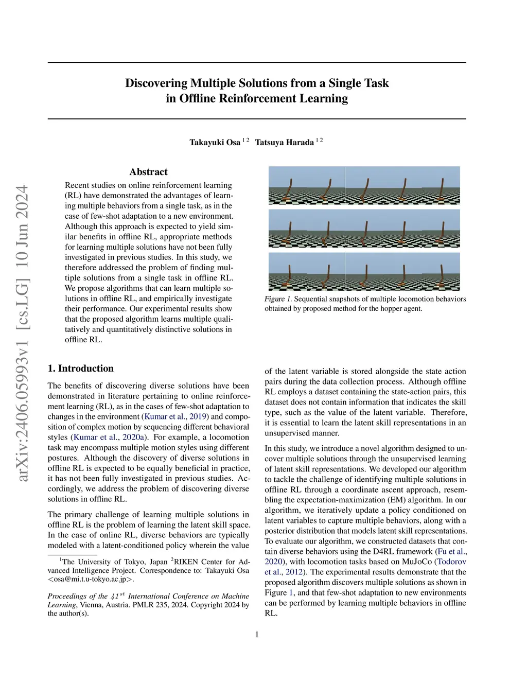 Recent studies on online reinforcement learning (RL) have demonstrated the advantages of learning multiple behaviors from a single task, as in the case of few-shot adaptation to a new environment. Although this approach is expected to yield similar benefits in offline RL, appropriate methods for learning multiple solutions have not been fully investigated in previous studies. In this study, we therefore addressed the problem of finding multiple solutions from a single task in offline RL. We propose algorithms that can learn multiple solutions in offline RL, and empirically investigate their performance. Our experimental results show that the proposed algorithm learns multiple qualitatively and quantitatively distinctive solutions in offline RL.