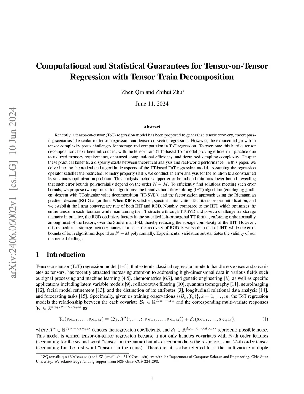 Recently, a tensor-on-tensor (ToT) regression model has been proposed to generalize tensor recovery, encompassing scenarios like scalar-on-tensor regression and tensor-on-vector regression. However, the exponential growth in tensor complexity poses challenges for storage and computation in ToT regression. To overcome this hurdle, tensor decompositions have been introduced, with the tensor train (TT)-based ToT model proving efficient in practice due to reduced memory requirements, enhanced computational efficiency, and decreased sampling complexity. Despite these practical benefits, a disparity exists between theoretical analysis and real-world performance. In this paper, we delve into the theoretical and algorithmic aspects of the TT-based ToT regression model. Assuming the regression operator satisfies the restricted isometry property (RIP), we conduct an error analysis for the solution to a constrained least-squares optimization problem. This analysis includes upper error bound and minimax lower bound, revealing that such error bounds polynomially depend on the order . To efficiently find solutions meeting such error bounds, we propose two optimization algorithms: the iterative hard thresholding (IHT) algorithm (employing gradient descent with TT-singular value decomposition (TT-SVD)) and the factorization approach using the Riemannian gradient descent (RGD) algorithm. When RIP is satisfied, spectral initialization facilitates proper initialization, and we establish the linear convergence rate of both IHT and RGD.