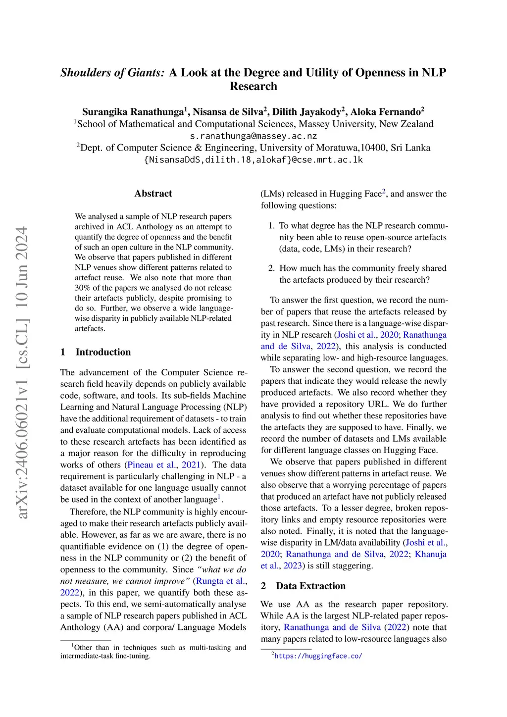 We analysed a sample of NLP research papers archived in ACL Anthology as an attempt to quantify the degree of openness and the benefit of such an open culture in the NLP community. We observe that papers published in different NLP venues show different patterns related to artefact reuse. We also note that more than 30% of the papers we analysed do not release their artefacts publicly, despite promising to do so. Further, we observe a wide language-wise disparity in publicly available NLP-related artefacts.