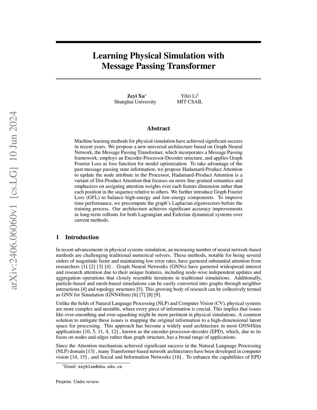 Machine learning methods for physical simulation have achieved significant success in recent years. We propose a new universal architecture based on Graph Neural Network, the Message Passing Transformer, which incorporates a Message Passing framework, employs an Encoder-Processor-Decoder structure, and applies Graph Fourier Loss as loss function for model optimization. To take advantage of the past message passing state information, we propose Hadamard-Product Attention to update the node attribute in the Processor, Hadamard-Product Attention is a variant of Dot-Product Attention that focuses on more fine-grained semantics and emphasizes on assigning attention weights over each feature dimension rather than each position in the sequence relative to others. We further introduce Graph Fourier Loss (GFL) to balance high-energy and low-energy components. To improve time performance, we precompute the graph's Laplacian eigenvectors before the training process. Our architecture achieves significant accuracy improvements in long-term rollouts for both Lagrangian and Eulerian dynamical systems over current methods.