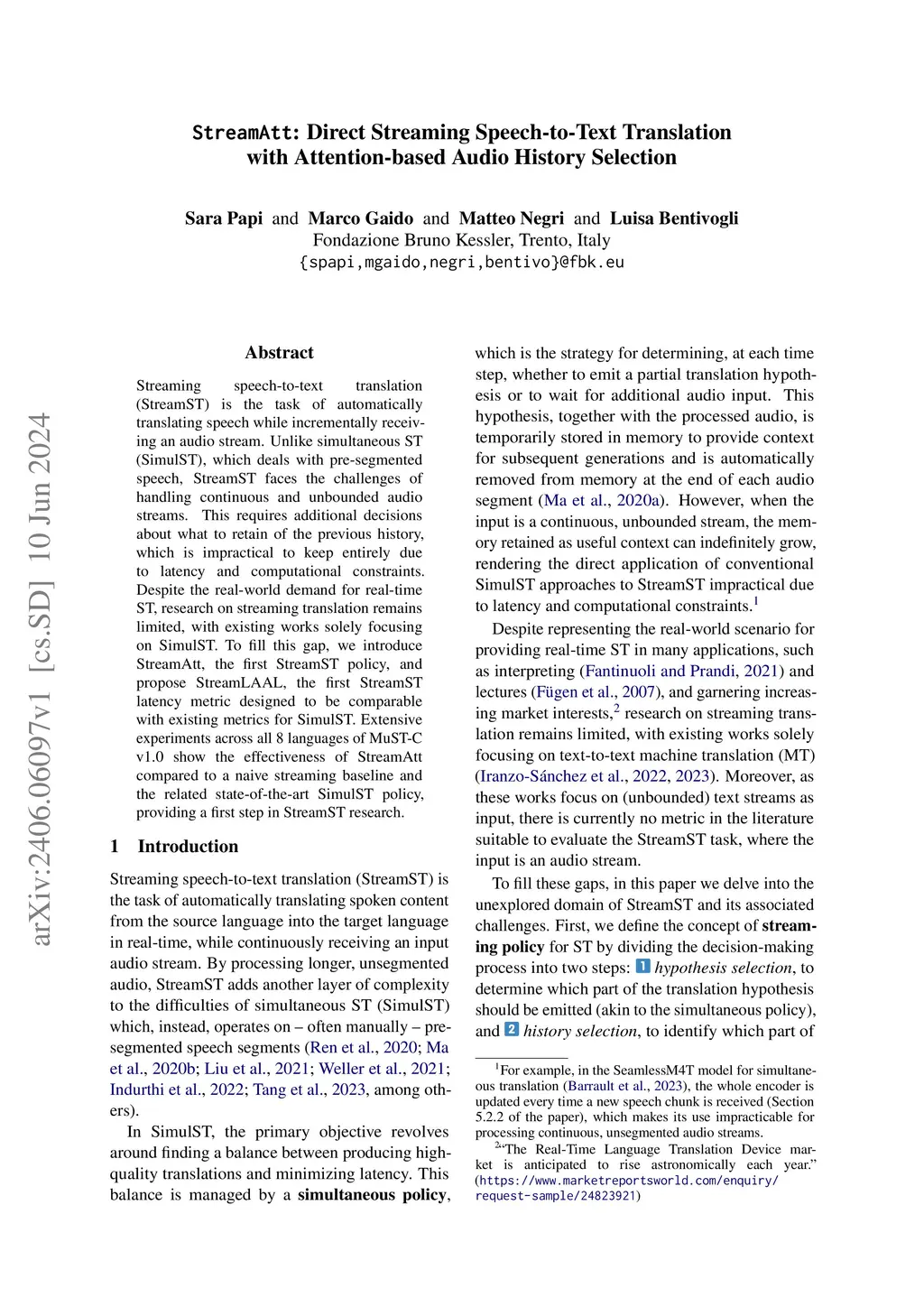 Streaming speech-to-text translation (StreamST) is the task of automatically translating speech while incrementally receiving an audio stream. Unlike simultaneous ST (SimulST), which deals with pre-segmented speech, StreamST faces the challenges of handling continuous and unbounded audio streams. This requires additional decisions about what to retain of the previous history, which is impractical to keep entirely due to latency and computational constraints. Despite the real-world demand for real-time ST, research on streaming translation remains limited, with existing works solely focusing on SimulST. To fill this gap, we introduce StreamAtt, the first StreamST policy, and propose StreamLAAL, the first StreamST latency metric designed to be comparable with existing metrics for SimulST. Extensive experiments across all 8 languages of MuST-C v1.0 show the effectiveness of StreamAtt compared to a naive streaming baseline and the related state-of-the-art SimulST policy, providing a first step in StreamST research.
