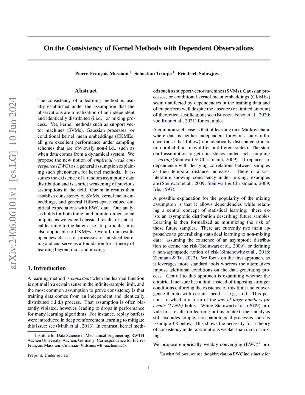 The consistency of a learning method is usually established under the assumption that the observations are a realization of an independent and identically distributed (i.i.d.) or mixing process. Yet, kernel methods such as support vector machines (SVMs), Gaussian processes, or conditional kernel mean embeddings (CKMEs) all give excellent performance under sampling schemes that are obviously non-i.i.d., such as when data comes from a dynamical system. We propose the new notion of empirical weak convergence (EWC) as a general assumption explaining such phenomena for kernel methods. It assumes the existence of a random asymptotic data distribution and is a strict weakening of previous assumptions in the field. Our main results then establish consistency of SVMs, kernel mean embeddings, and general Hilbert-space valued empirical expectations with EWC data. Our analysis holds for both finite- and infinite-dimensional outputs, as we extend classical results of statistical learning to the latter case. In particular, it is also applicable to CKMEs. Overall, our results open new classes of processes to statistical learning and can serve as a foundation for a theory of learning beyond i.i.d. and mixing.
