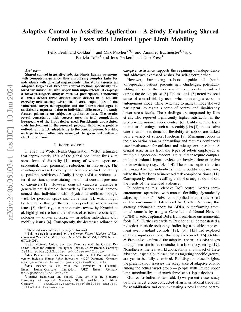 Shared control in assistive robotics blends human autonomy with computer assistance, thus simplifying complex tasks for individuals with physical impairments. This study assesses an adaptive Degrees of Freedom control method specifically tailored for individuals with upper limb impairments. It employs a between-subjects analysis with 24 participants, conducting 81 trials across three distinct input devices in a realistic everyday-task setting. Given the diverse capabilities of the vulnerable target demographic and the known challenges in statistical comparisons due to individual differences, the study focuses primarily on subjective qualitative data. The results reveal consistently high success rates in trial completions, irrespective of the input device used. Participants appreciated their involvement in the research process, displayed a positive outlook, and quick adaptability to the control system. Notably, each participant effectively managed the given task within a short time frame.