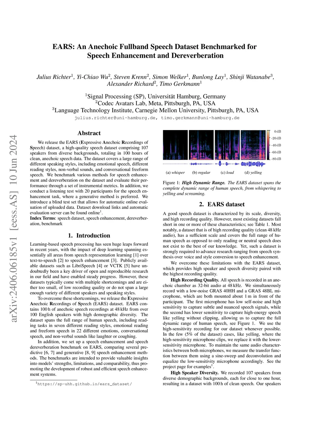 We release the EARS (Expressive Anechoic Recordings of Speech) dataset, a high-quality speech dataset comprising 107 speakers from diverse backgrounds, totaling in 100 hours of clean, anechoic speech data. The dataset covers a large range of different speaking styles, including emotional speech, different reading styles, non-verbal sounds, and conversational freeform speech. We benchmark various methods for speech enhancement and dereverberation on the dataset and evaluate their performance through a set of instrumental metrics. In addition, we conduct a listening test with 20 participants for the speech enhancement task, where a generative method is preferred. We introduce a blind test set that allows for automatic online evaluation of uploaded data. Dataset download links and automatic evaluation server can be found online.