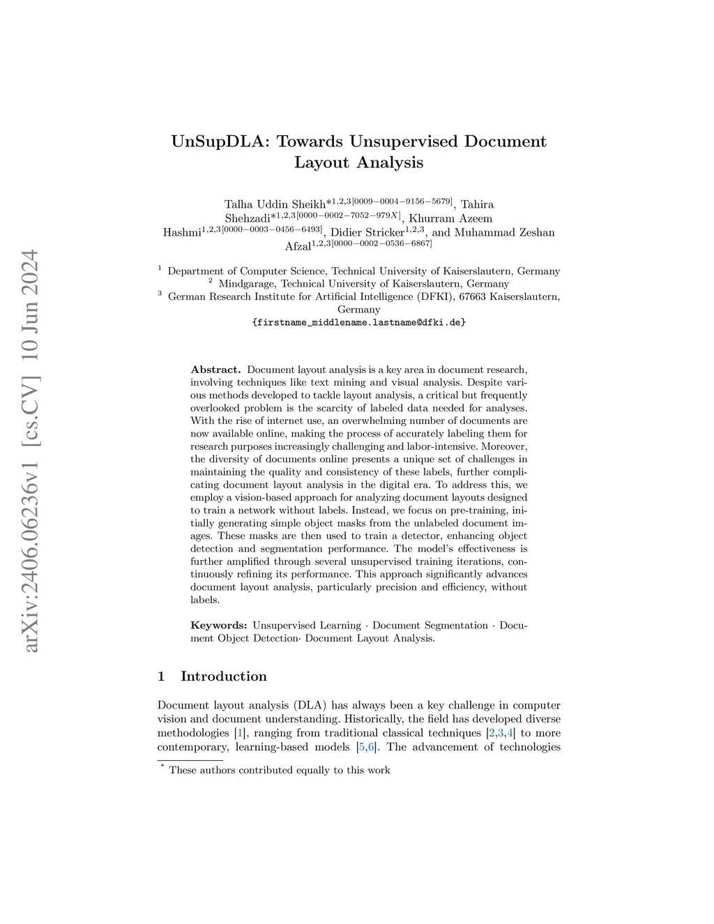 Document layout analysis is a key area in document research, involving techniques like text mining and visual analysis. Despite various methods developed to tackle layout analysis, a critical but frequently overlooked problem is the scarcity of labeled data needed for analyses. With the rise of internet use, an overwhelming number of documents are now available online, making the process of accurately labeling them for research purposes increasingly challenging and labor-intensive. Moreover, the diversity of documents online presents a unique set of challenges in maintaining the quality and consistency of these labels, further complicating document layout analysis in the digital era. To address this, we employ a vision-based approach for analyzing document layouts designed to train a network without labels. Instead, we focus on pre-training, initially generating simple object masks from the unlabeled document images. These masks are then used to train a detector, enhancing object detection and segmentation performance. The model's effectiveness is further amplified through several unsupervised training iterations, continuously refining its performance. This approach significantly advances document layout analysis, particularly precision and efficiency, without labels.