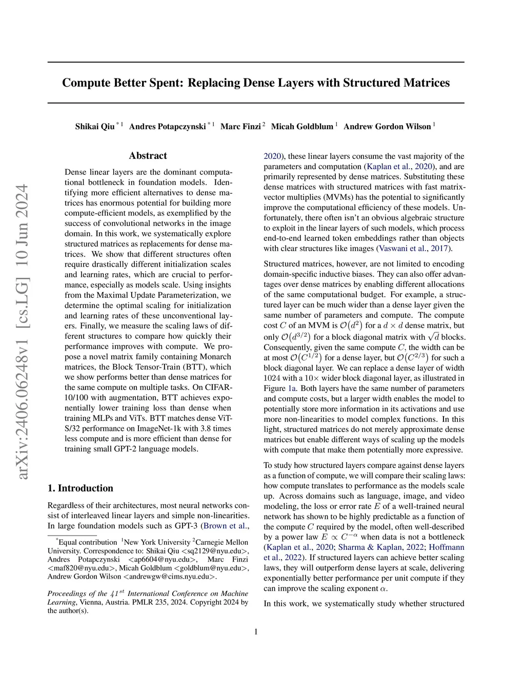 Dense linear layers are the dominant computational bottleneck in foundation models. Identifying more efficient alternatives to dense matrices has enormous potential for building more compute-efficient models, as exemplified by the success of convolutional networks in the image domain. In this work, we systematically explore structured matrices as replacements for dense matrices. We show that different structures often require drastically different initialization scales and learning rates, which are crucial to performance, especially as models scale. Using insights from the Maximal Update Parameterization, we determine the optimal scaling for initialization and learning rates of these unconventional layers. Finally, we measure the scaling laws of different structures to compare how quickly their performance improves with compute. We propose a novel matrix family containing Monarch matrices, the Block Tensor-Train (BTT), which we show performs better than dense matrices for the same compute on multiple tasks. On CIFAR-10/100 with augmentation, BTT achieves exponentially lower training loss than dense when training MLPs and ViTs. BTT matches dense ViT-S/32 performance on ImageNet-1k with 3.8 times less compute and is more efficient than dense for training small GPT-2 language models.