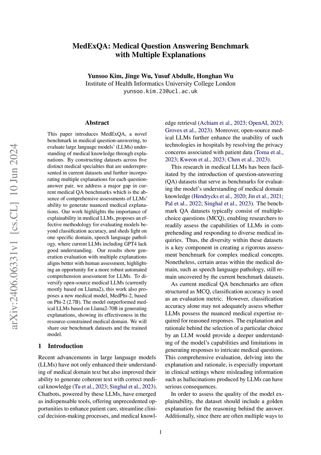 This paper introduces MedExQA, a novel benchmark in medical question-answering, to evaluate large language models' (LLMs) understanding of medical knowledge through explanations. By constructing datasets across five distinct medical specialties that are underrepresented in current datasets and further incorporating multiple explanations for each question-answer pair, we address a major gap in current medical QA benchmarks which is the absence of comprehensive assessments of LLMs' ability to generate nuanced medical explanations. Our work highlights the importance of explainability in medical LLMs, proposes an effective methodology for evaluating models beyond classification accuracy, and sheds light on one specific domain, speech language pathology, where current LLMs including GPT4 lack good understanding. Our results show generation evaluation with multiple explanations aligns better with human assessment, highlighting an opportunity for a more robust automated comprehension assessment for LLMs. To diversify open-source medical LLMs (currently mostly based on Llama2), this work also proposes a new medical model, MedPhi-2, based on Phi-2 (2.7B). The model outperformed medical LLMs based on Llama2-70B in generating explanations, showing its effectiveness in the resource-constrained medical domain. We will share our benchmark datasets and the trained model.