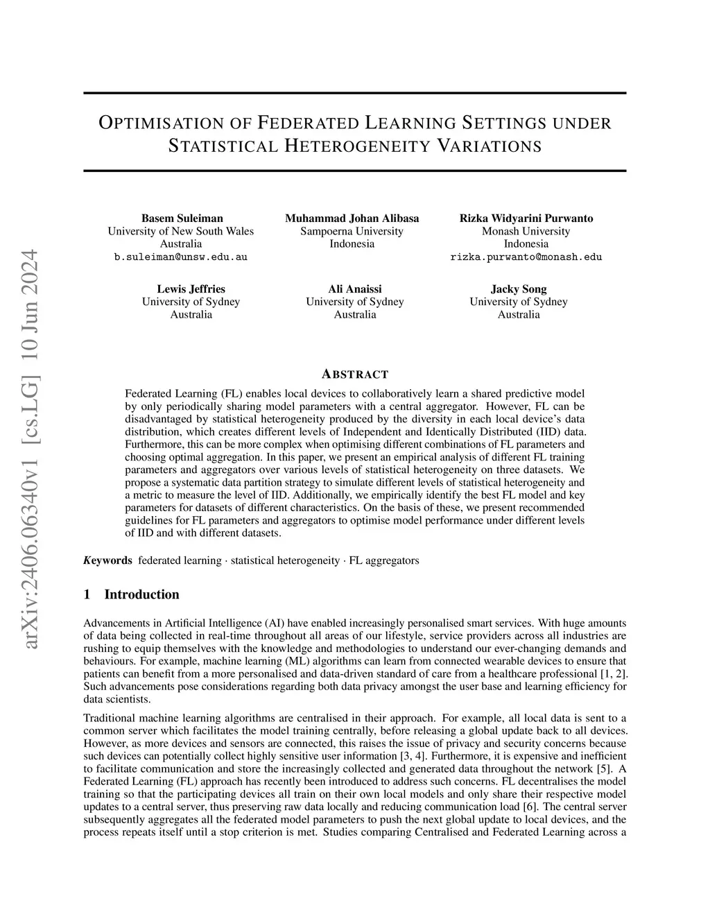 Federated Learning (FL) enables local devices to collaboratively learn a shared predictive model by only periodically sharing model parameters with a central aggregator. However, FL can be disadvantaged by statistical heterogeneity produced by the diversity in each local devices data distribution, which creates different levels of Independent and Identically Distributed (IID) data. Furthermore, this can be more complex when optimising different combinations of FL parameters and choosing optimal aggregation. In this paper, we present an empirical analysis of different FL training parameters and aggregators over various levels of statistical heterogeneity on three datasets. We propose a systematic data partition strategy to simulate different levels of statistical heterogeneity and a metric to measure the level of IID. Additionally, we empirically identify the best FL model and key parameters for datasets of different characteristics. On the basis of these, we present recommended guidelines for FL parameters and aggregators to optimise model performance under different levels of IID and with different datasets