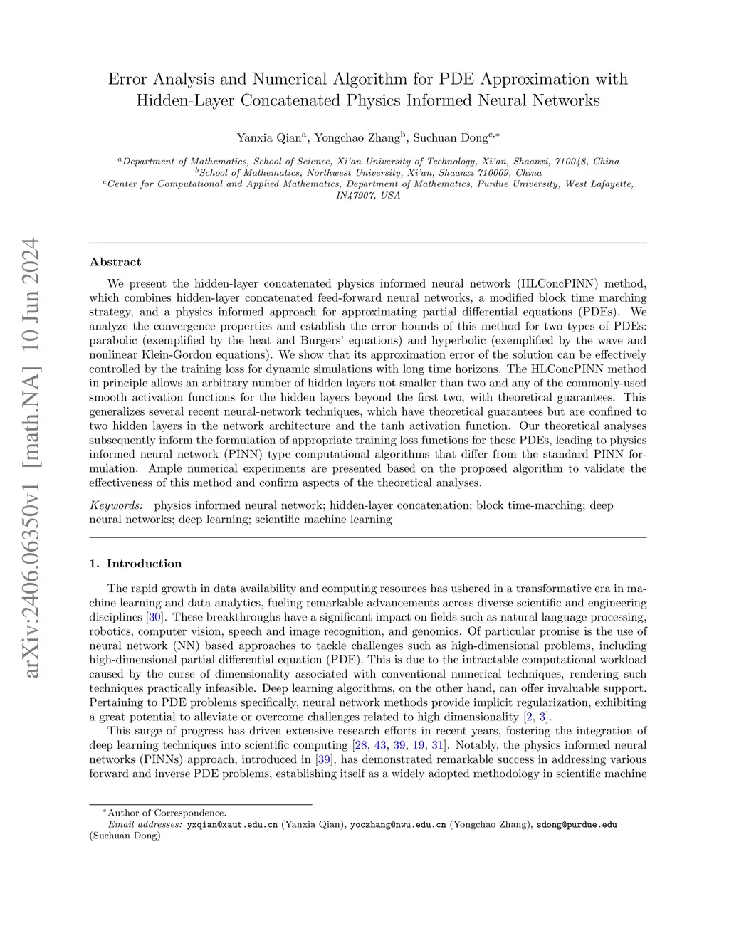 We present the hidden-layer concatenated physics informed neural network (HLConcPINN) method, which combines hidden-layer concatenated feed-forward neural networks, a modified block time marching strategy, and a physics informed approach for approximating partial differential equations (PDEs). We analyze the convergence properties and establish the error bounds of this method for two types of PDEs: parabolic (exemplified by the heat and Burgers' equations) and hyperbolic (exemplified by the wave and nonlinear Klein-Gordon equations). We show that its approximation error of the solution can be effectively controlled by the training loss for dynamic simulations with long time horizons. The HLConcPINN method in principle allows an arbitrary number of hidden layers not smaller than two and any of the commonly-used smooth activation functions for the hidden layers beyond the first two, with theoretical guarantees. This generalizes several recent neural-network techniques, which have theoretical guarantees but are confined to two hidden layers in the network architecture and the activation function. Our theoretical analyses subsequently inform the formulation of appropriate training loss functions for these PDEs, leading to physics informed neural network (PINN) type computational algorithms that differ from the standard PINN formulation. Ample numerical experiments are presented based on the proposed algorithm to validate the effectiveness of this method and confirm aspects of the theoretical analyses.