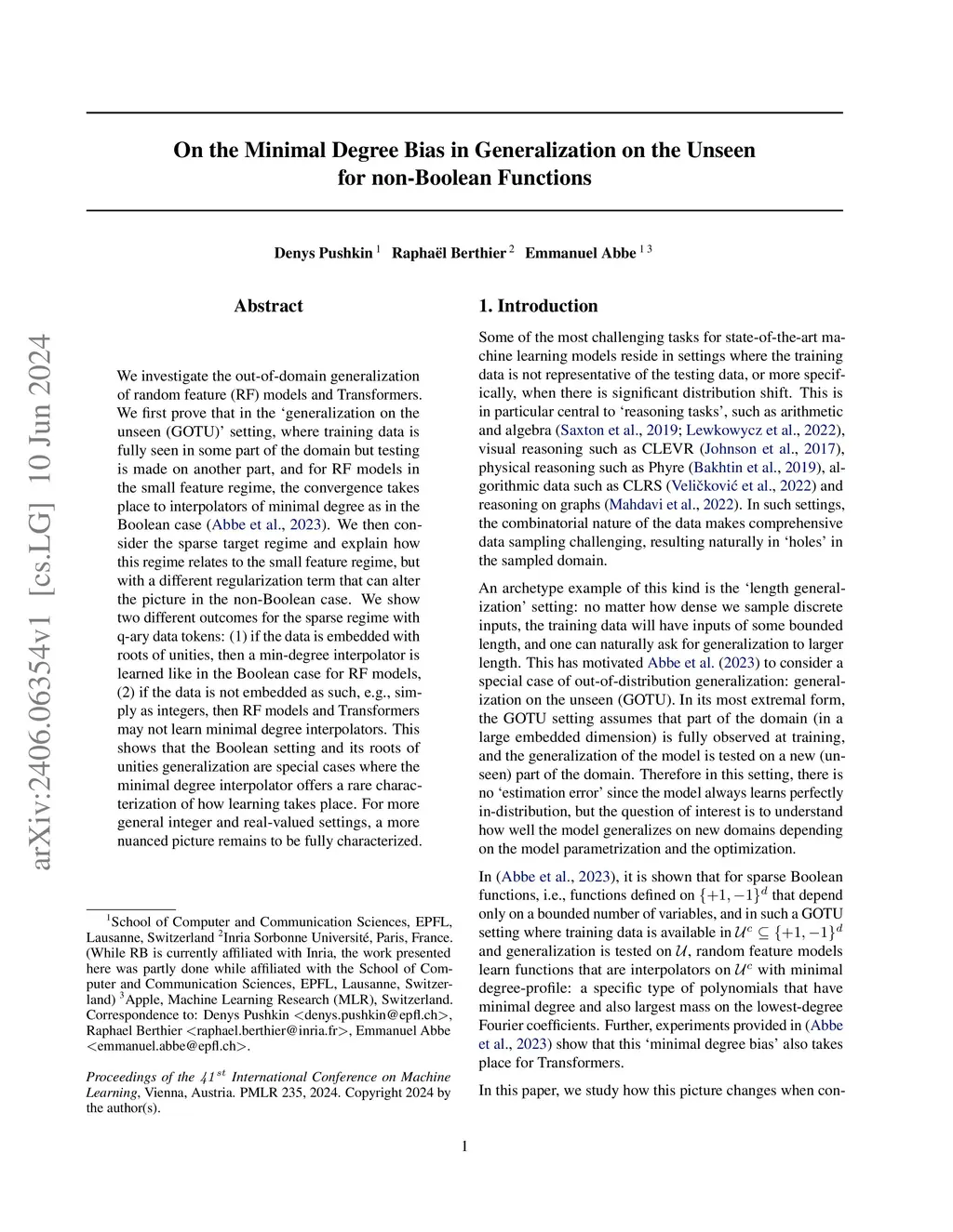 We investigate the out-of-domain generalization of random feature (RF) models and Transformers. We first prove that in the `generalization on the unseen (GOTU)' setting, where training data is fully seen in some part of the domain but testing is made on another part, and for RF models in the small feature regime, the convergence takes place to interpolators of minimal degree as in the Boolean case (Abbe et al., 2023). We then consider the sparse target regime and explain how this regime relates to the small feature regime, but with a different regularization term that can alter the picture in the non-Boolean case. We show two different outcomes for the sparse regime with q-ary data tokens: (1) if the data is embedded with roots of unities, then a min-degree interpolator is learned like in the Boolean case for RF models, (2) if the data is not embedded as such, e.g., simply as integers, then RF models and Transformers may not learn minimal degree interpolators. This shows that the Boolean setting and its roots of unities generalization are special cases where the minimal degree interpolator offers a rare characterization of how learning takes place. For more general integer and real-valued settings, a more nuanced picture remains to be fully characterized.