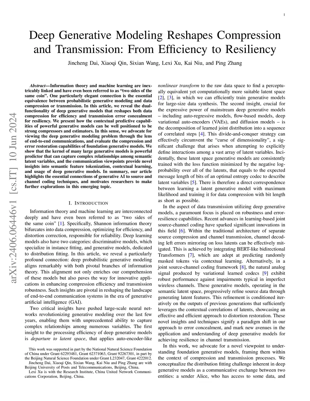 Information theory and machine learning are inextricably linked and have even been referred to as "two sides of the same coin". One particularly elegant connection is the essential equivalence between probabilistic generative modeling and data compression or transmission. In this article, we reveal the dual-functionality of deep generative models that reshapes both data compression for efficiency and transmission error concealment for resiliency. We present how the contextual predictive capabilities of powerful generative models can be well positioned to be strong compressors and estimators. In this sense, we advocate for viewing the deep generative modeling problem through the lens of end-to-end communications, and evaluate the compression and error restoration capabilities of foundation generative models. We show that the kernel of many large generative models is powerful predictor that can capture complex relationships among semantic latent variables, and the communication viewpoints provide novel insights into semantic feature tokenization, contextual learning, and usage of deep generative models. In summary, our article highlights the essential connections of generative AI to source and channel coding techniques, and motivates researchers to make further explorations in this emerging topic.