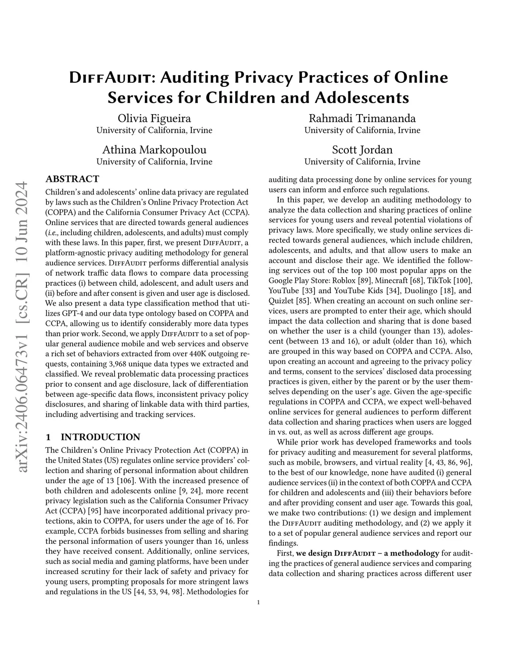 DiffAudit: Auditing Privacy Practices of Online Services for Children