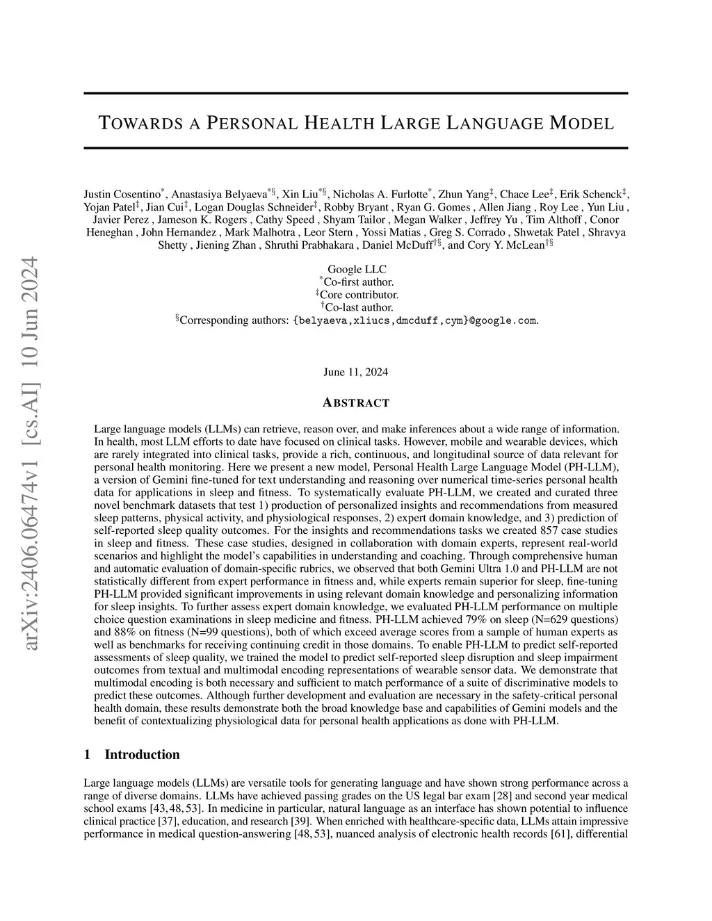 In health, most large language model (LLM) research has focused on clinical tasks. However, mobile and wearable devices, which are rarely integrated into such tasks, provide rich, longitudinal data for personal health monitoring. Here we present Personal Health Large Language Model (PH-LLM), fine-tuned from Gemini for understanding and reasoning over numerical time-series personal health data. We created and curated three datasets that test 1) production of personalized insights and recommendations from sleep patterns, physical activity, and physiological responses, 2) expert domain knowledge, and 3) prediction of self-reported sleep outcomes. For the first task we designed 857 case studies in collaboration with domain experts to assess real-world scenarios in sleep and fitness. Through comprehensive evaluation of domain-specific rubrics, we observed that Gemini Ultra 1.0 and PH-LLM are not statistically different from expert performance in fitness and, while experts remain superior for sleep, fine-tuning PH-LLM provided significant improvements in using relevant domain knowledge and personalizing information for sleep insights. We evaluated PH-LLM domain knowledge using multiple choice sleep medicine and fitness examinations. PH-LLM achieved 79% on sleep and 88% on fitness, exceeding average scores from a sample of human experts. Finally, we trained PH-LLM to predict self-reported sleep quality outcomes from textual and multimodal encoding representations of wearable data, and demonstrate that multimodal encoding is required to match performance of specialized discriminative models. Although further development and evaluation are necessary in the safety-critical personal health domain, these results demonstrate both the broad knowledge and capabilities of Gemini models and the benefit of contextualizing physiological data for personal health applications as done with PH-LLM.