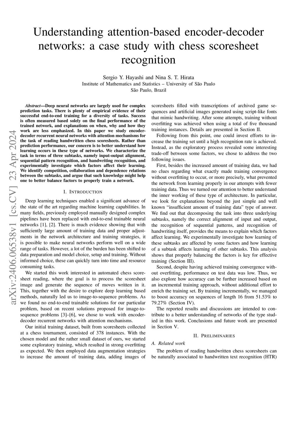 Deep neural networks are largely used for complex prediction tasks. There is plenty of empirical evidence of their successful end-to-end training for a diversity of tasks. Success is often measured based solely on the final performance of the trained network, and explanations on when, why and how they work are less emphasized. In this paper we study encoder-decoder recurrent neural networks with attention mechanisms for the task of reading handwritten chess scoresheets. Rather than prediction performance, our concern is to better understand how learning occurs in these type of networks. We characterize the task in terms of three subtasks, namely input-output alignment, sequential pattern recognition, and handwriting recognition, and experimentally investigate which factors affect their learning. We identify competition, collaboration and dependence relations between the subtasks, and argue that such knowledge might help one to better balance factors to properly train a network.