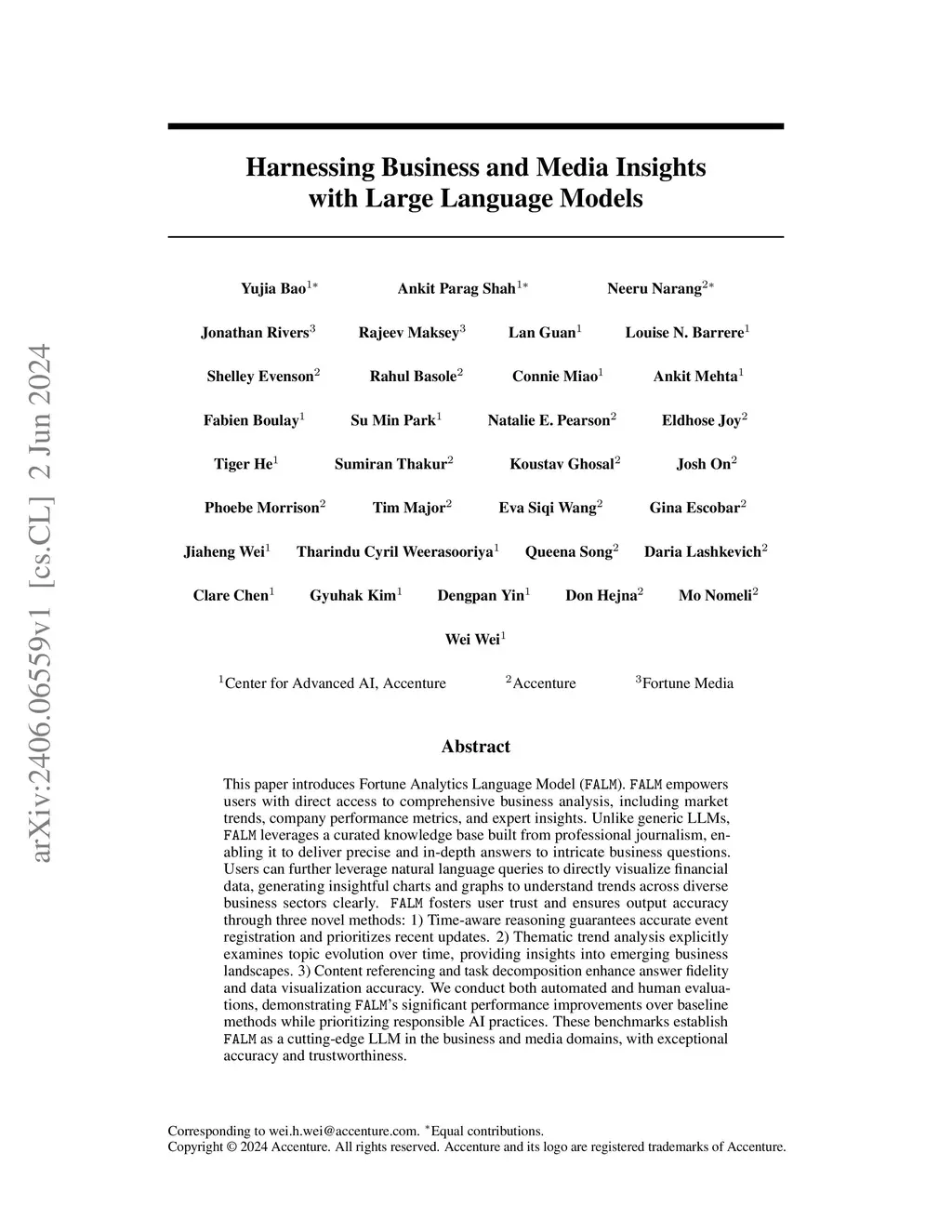 This paper introduces Fortune Analytics Language Model (FALM). FALM empowers users with direct access to comprehensive business analysis, including market trends, company performance metrics, and expert insights. Unlike generic LLMs, FALM leverages a curated knowledge base built from professional journalism, enabling it to deliver precise and in-depth answers to intricate business questions. Users can further leverage natural language queries to directly visualize financial data, generating insightful charts and graphs to understand trends across diverse business sectors clearly. FALM fosters user trust and ensures output accuracy through three novel methods: 1) Time-aware reasoning guarantees accurate event registration and prioritizes recent updates. 2) Thematic trend analysis explicitly examines topic evolution over time, providing insights into emerging business landscapes. 3) Content referencing and task decomposition enhance answer fidelity and data visualization accuracy. We conduct both automated and human evaluations, demonstrating FALM's significant performance improvements over baseline methods while prioritizing responsible AI practices. These benchmarks establish FALM as a cutting-edge LLM in the business and media domains, with exceptional accuracy and trustworthiness.