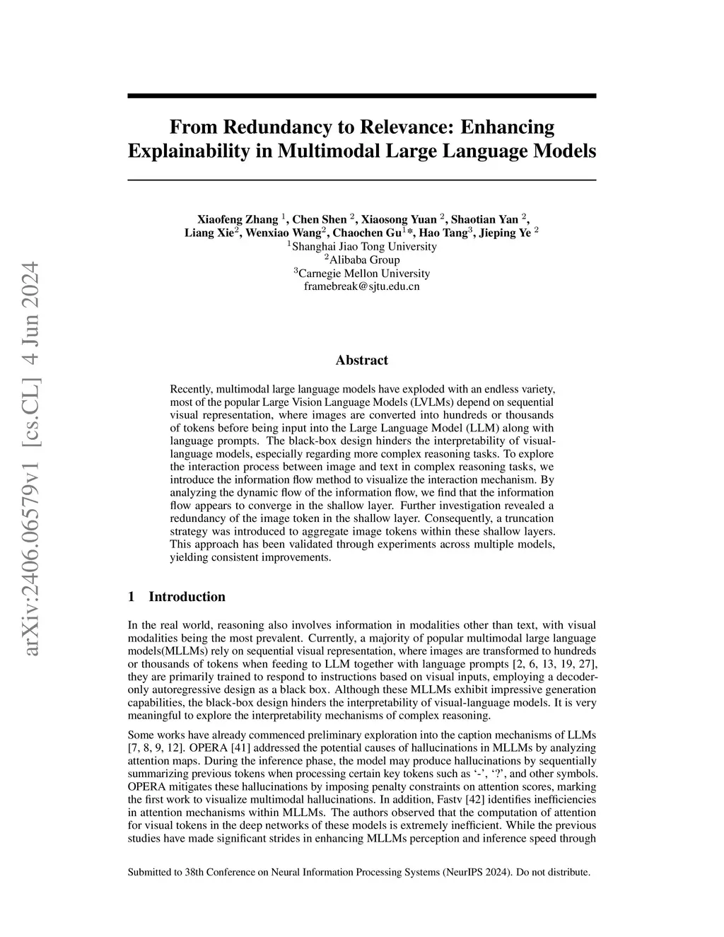 Recently, multimodal large language models have exploded with an endless variety, most of the popular Large Vision Language Models (LVLMs) depend on sequential visual representation, where images are converted into hundreds or thousands of tokens before being input into the Large Language Model (LLM) along with language prompts. The black-box design hinders the interpretability of visual-language models, especially regarding more complex reasoning tasks. To explore the interaction process between image and text in complex reasoning tasks, we introduce the information flow method to visualize the interaction mechanism. By analyzing the dynamic flow of the information flow, we find that the information flow appears to converge in the shallow layer. Further investigation revealed a redundancy of the image token in the shallow layer. Consequently, a truncation strategy was introduced to aggregate image tokens within these shallow layers. This approach has been validated through experiments across multiple models, yielding consistent improvements.